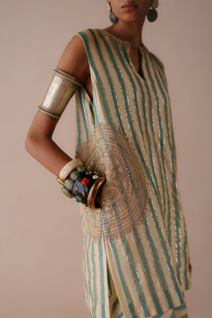 • This Co-ord Set in Blue Stripes is adorned with all over gota work, with heavy marodi embroidery accenting the pockets. It is paired with matching Chanderi Sharara and sheer organza duaptta.