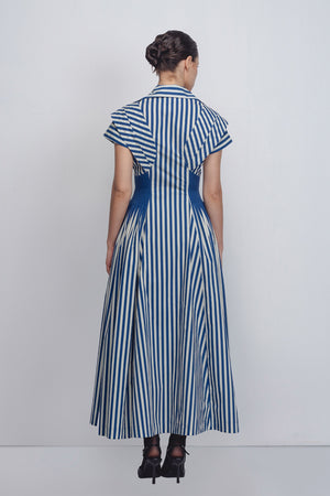 • A sculptural silhouette that explores the interplay of strategic pleating and bold stripes, this garment is crafted in striped 100% Cotton Poplin and showcases technical expertise in pattern making and precise construction. Pintucks at the waist create a cinched effect that opens out at the hips into a flared silhouette, adding volume toward the hem. The upper half is pleated at the shoulders, bringing emphasis, visual movement, and a sense of drama to the form. 55"
