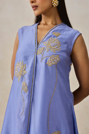 • This is an elegant two-piece kurta and pallazo set, crafted in fine Chanderi fabric and presented in a soft ink blue tone. The ensemble blends a clean, contemporary silhouette with delicate, story-driven applique embroidery inspired by Indian folk and nature motifs. Decorated with delicate antique-gold thread embroidery.