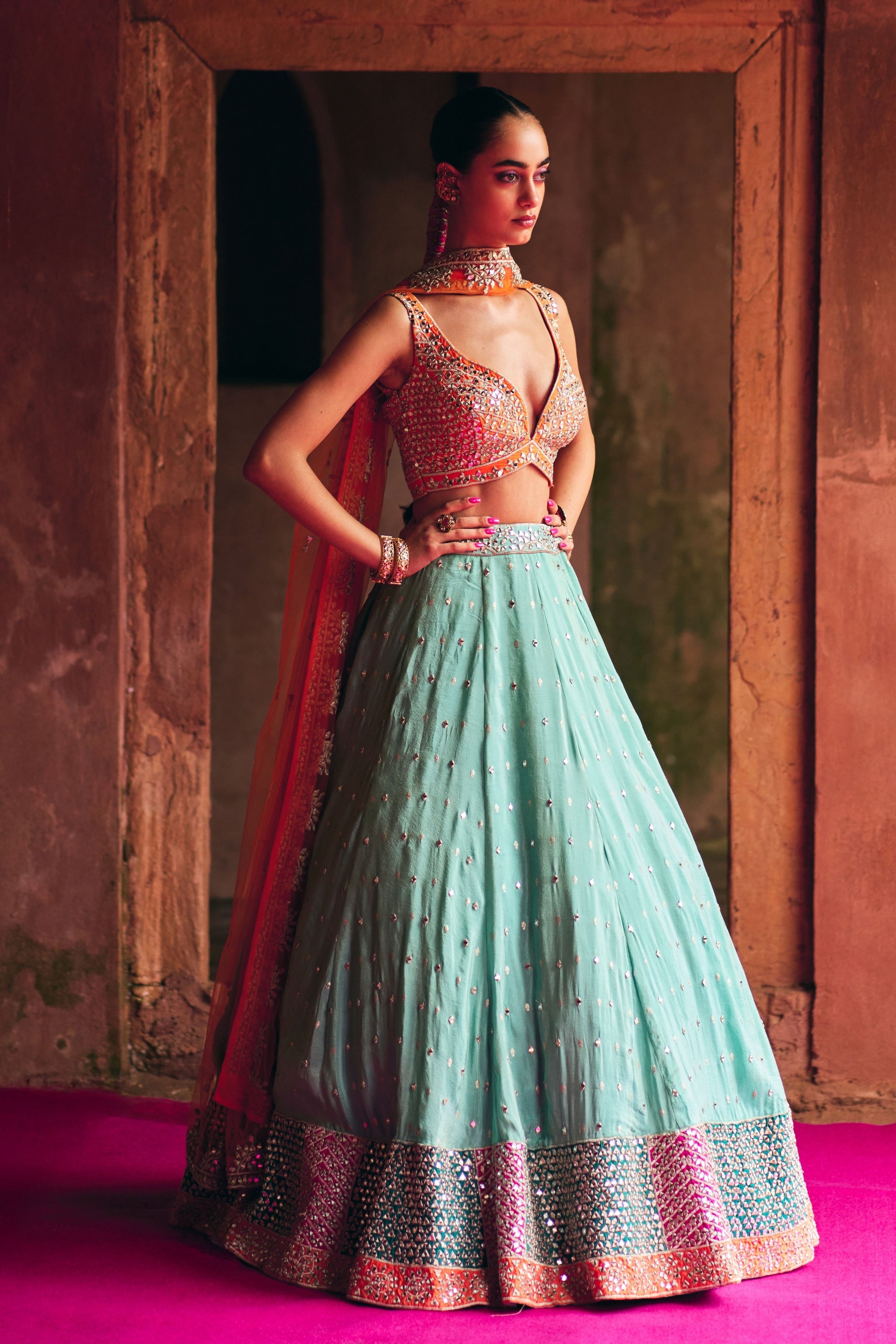 • Aqua lehenga with mirror embroidery and multicolor borders, paired with a striking orange blouse and dupatta.