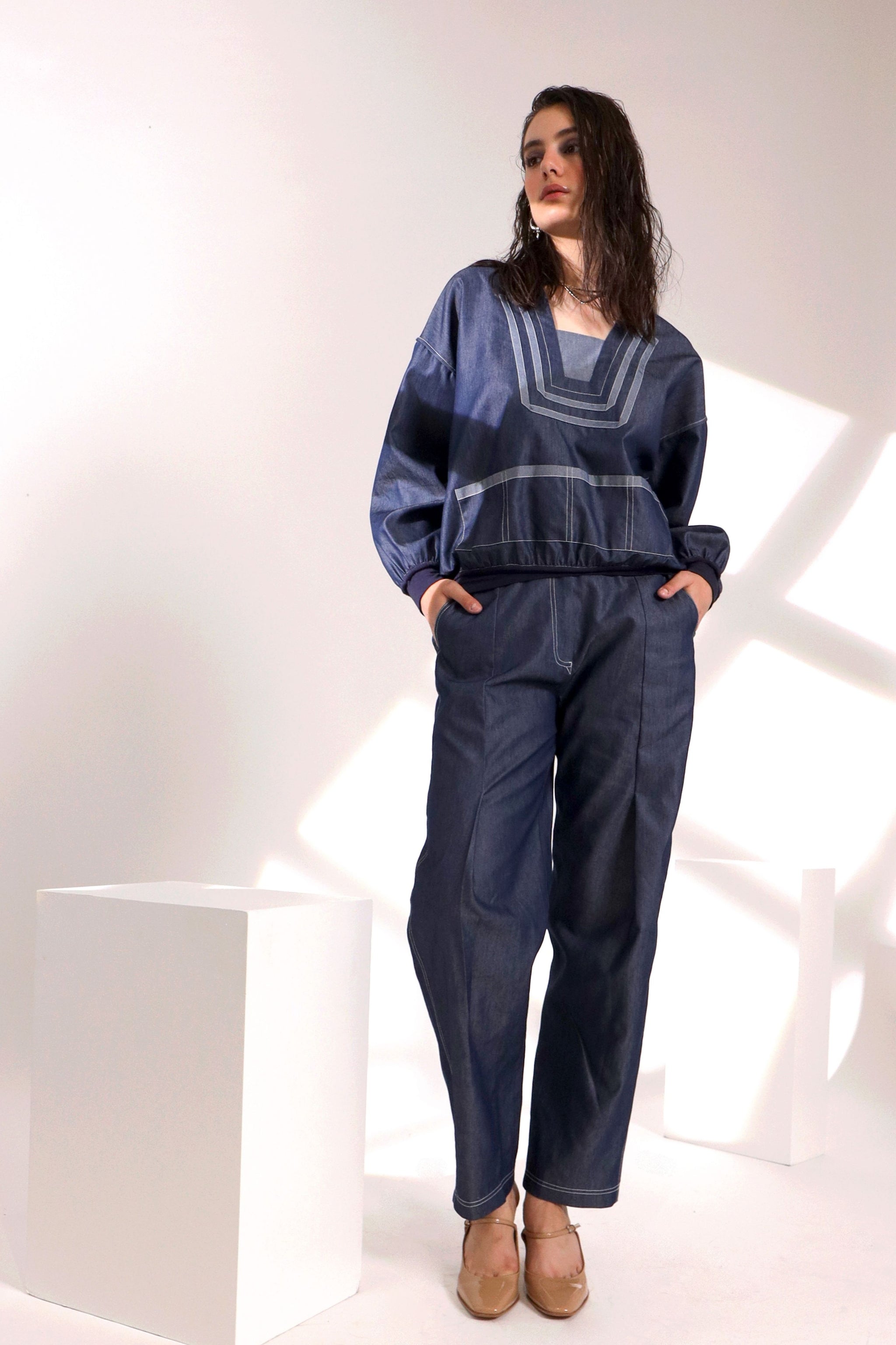 • These tailored denim co-ords redefine effortless sophistication with a sleek, structured fit. Designed with a high waist and clean front detailing, they offer a polished yet relaxed look. The tapered leg, finished with cuffed hems, adds a touch of versatility—perfect for dressing up or down. With precise stitching and a timeless silhouette, these jeans are a refined take on everyday denim. The parker top features contrast topstitching, voluminous sleeves, and ribbed cuffs for an overall comfortable fit.
