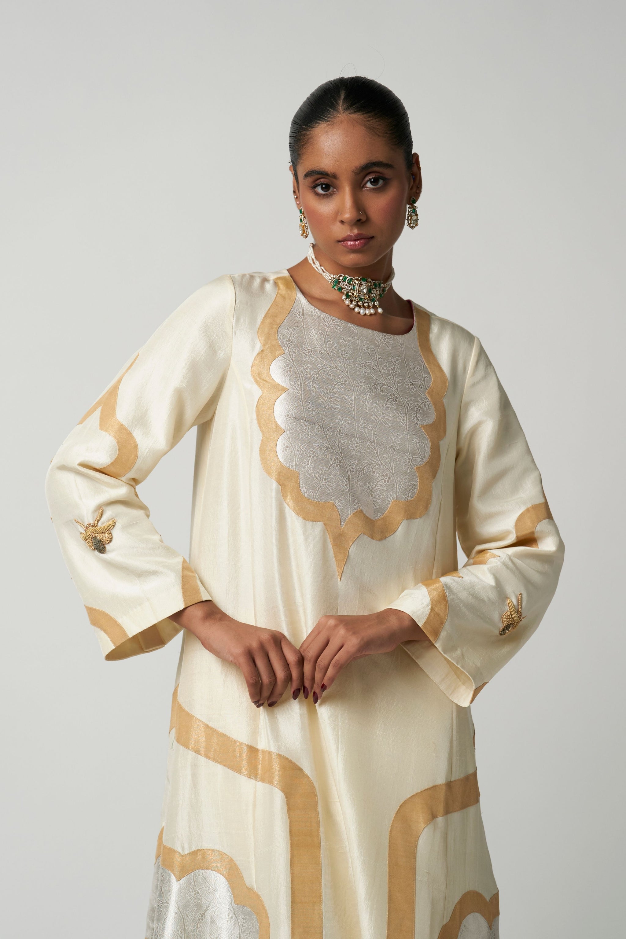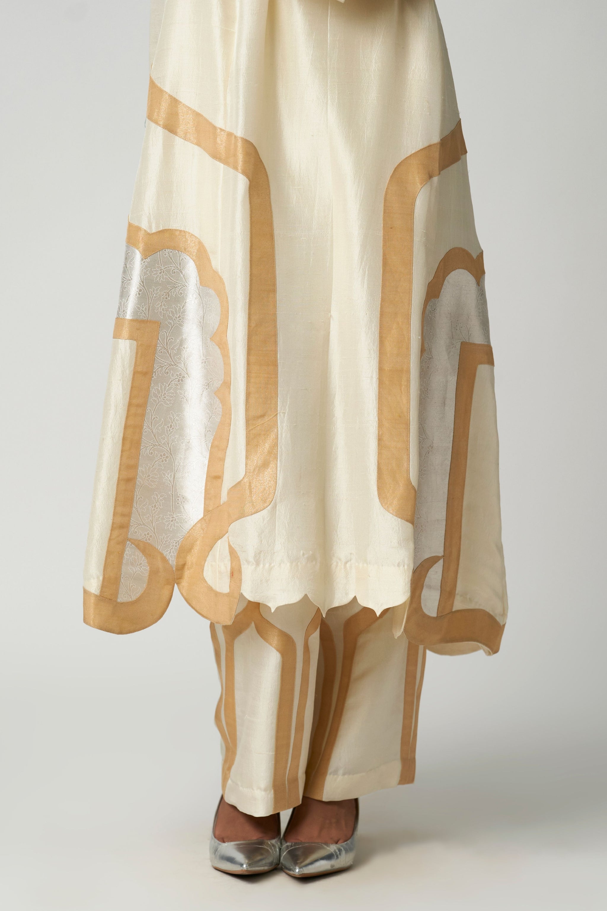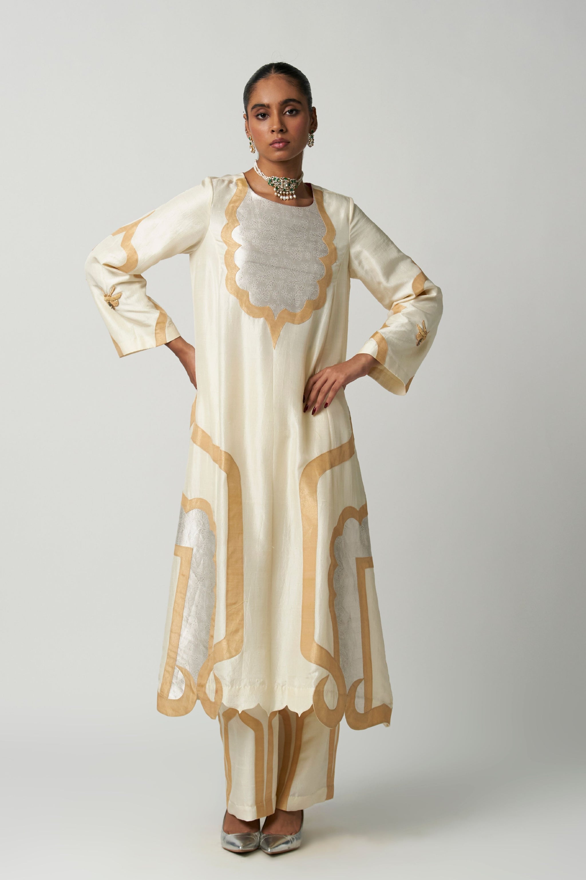• This stunning art deco moti mehrabiya kurta set features intricate tissue applique work in the shape of arches, inspired by classic architectural forms. The applique detailing adds subtle sheen and dimension to the rich silk fabric, making the kurta both unique and contemporary. Paired with sleek coordinated silk pants, this ensemble balances heritage artistry with modern tailoring, creating a look that is sophisticated, versatile, and effortlessly chic.