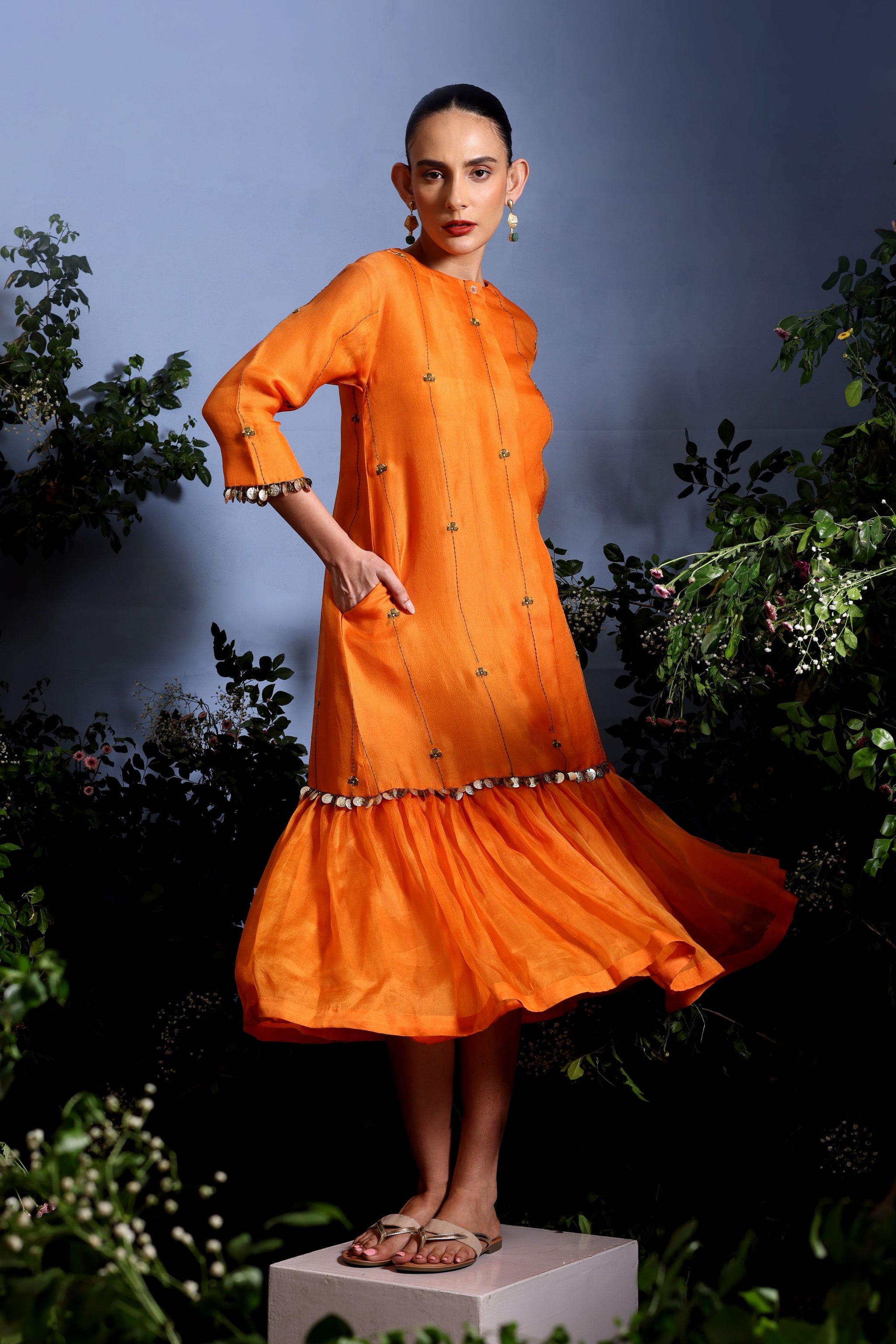 • This pure silk organza long buttoned shirt dress exudes effortless elegance, featuring pleated silk organza at the hem that adds graceful flare and movement. The bodice is adorned with hand-embroidered threadwork stripes, delicately detailed with Sassofras leaf motifs, bringing a subtle, botanical charm to the ensemble. Light, airy, and sophisticated, it celebrates artisanal craftsmanship while offering a fluid silhouette perfect for spring and warm-weather occasions.
