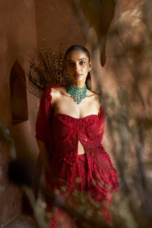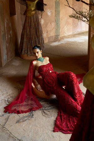 • A radiant red tube peplum richly detailed with 3D embroidery, adding depth and texture. Paired with flared pants and a dupatta featuring delicate, subtle embroidery for a romantic flair. Perfect for festive celebrations, this ensemble blends traditional charm with modern sophistication.