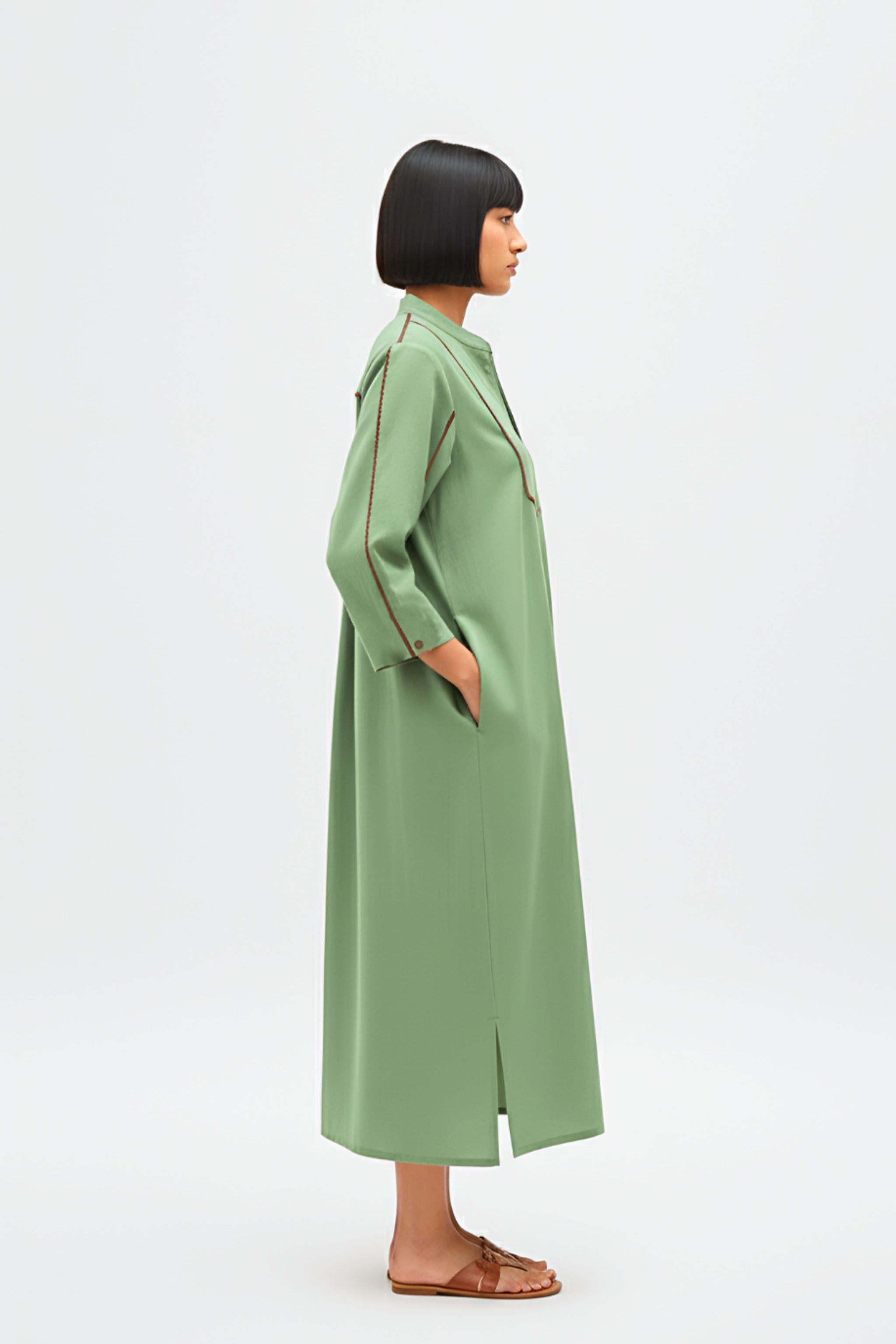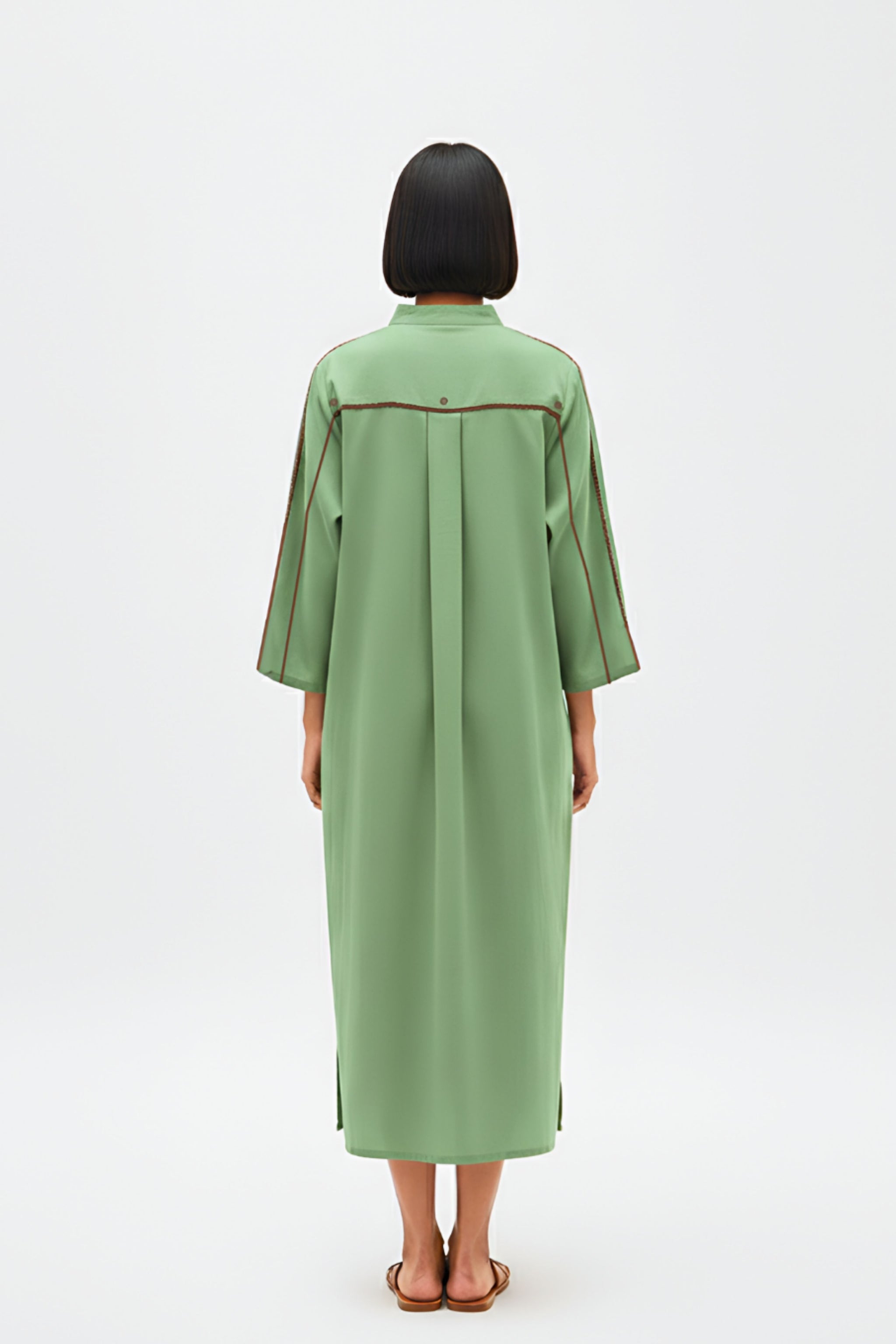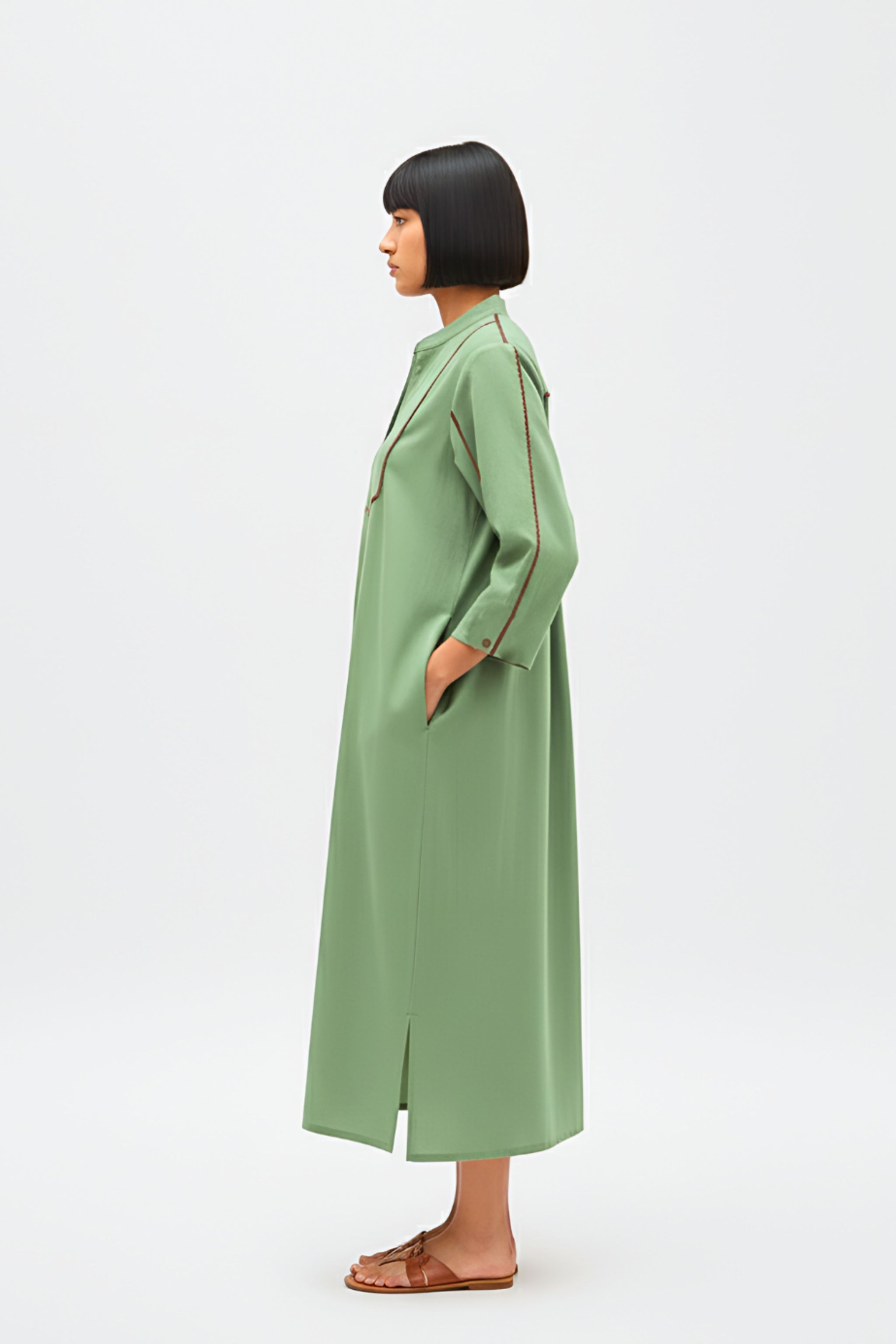 • This charming dress comes in a delightful asparagus green-tuscan red hue and features unique trumpet sleeves with stripes of tuscan red, a stand collar, wooden button detailing, collared v-neck that give it a structured look. The back of the dress wooden button detail on the yoke. With its classic and comfortable fit, it effortlessly blends elegance and ease. Perfect for making a seamless transition from day to night.