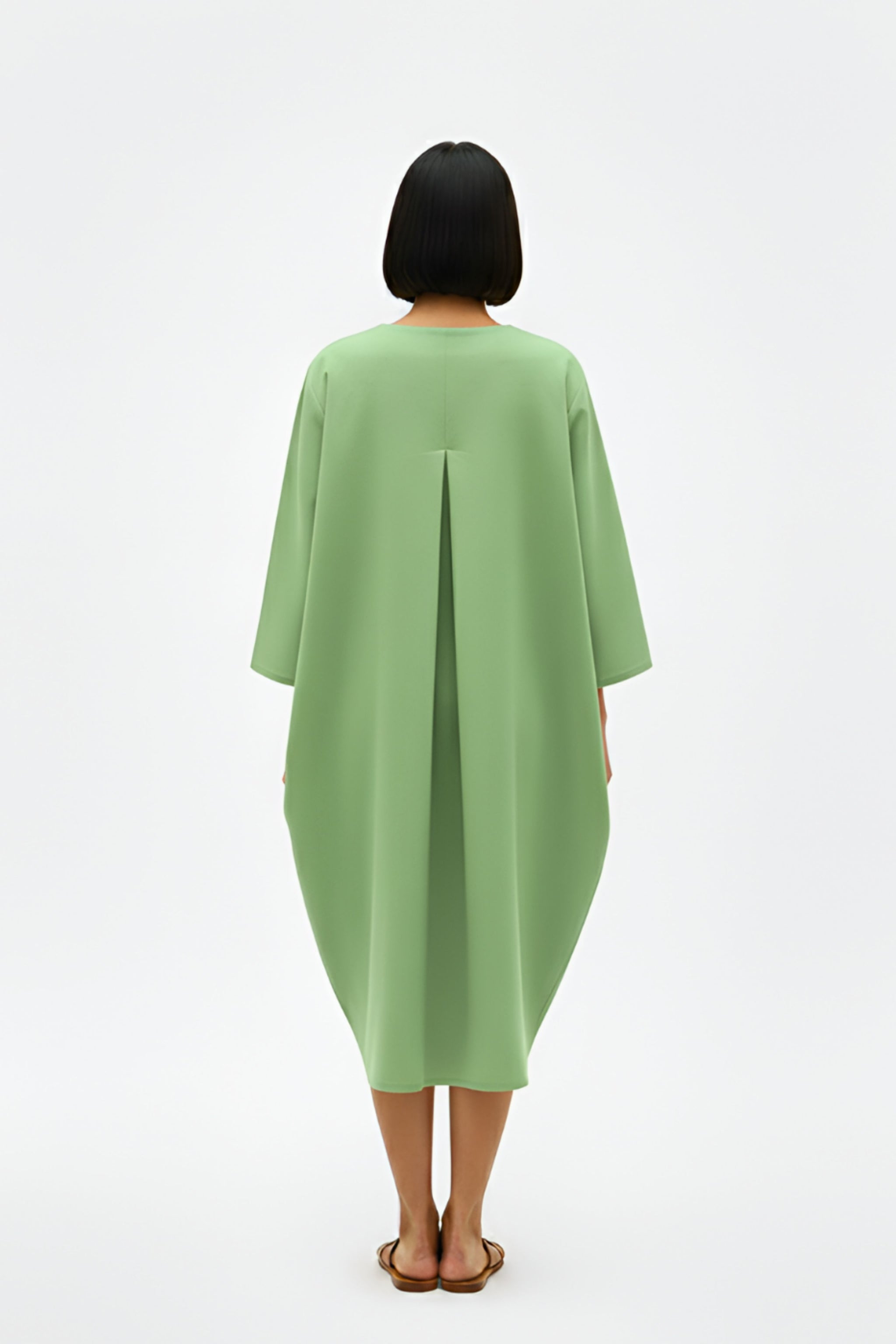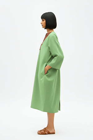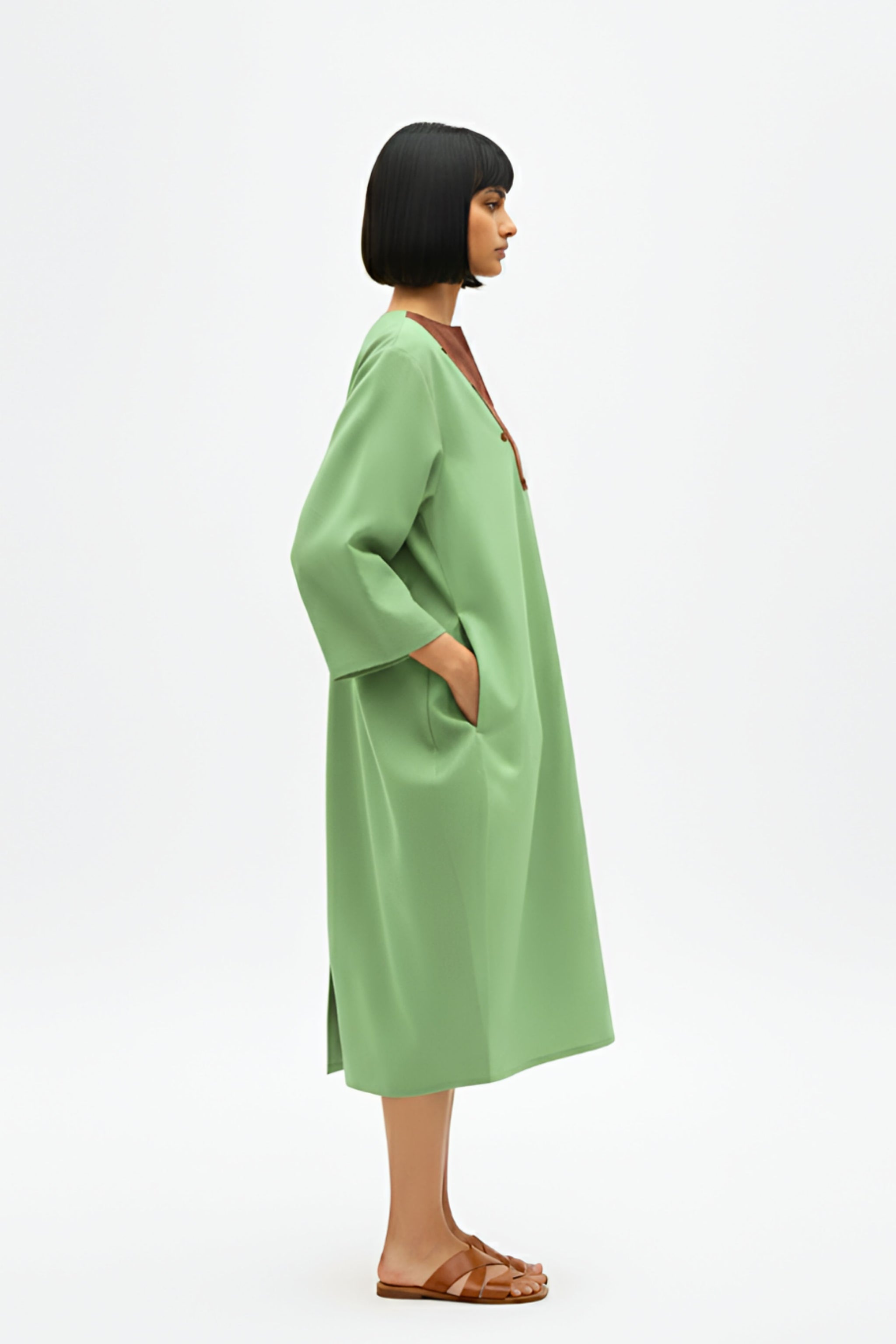 • This lovely short dress in a lively asparagus green-tuscan red color has unique wooden details that add a touch of charm. It features quarter-trumpet sleeves, giving it a stylish look. With its knee length, this dress beautifully combines elegance and playfulness, making it perfect for casual outings and special occasions. Perfect for making a seamless transition from day to night.