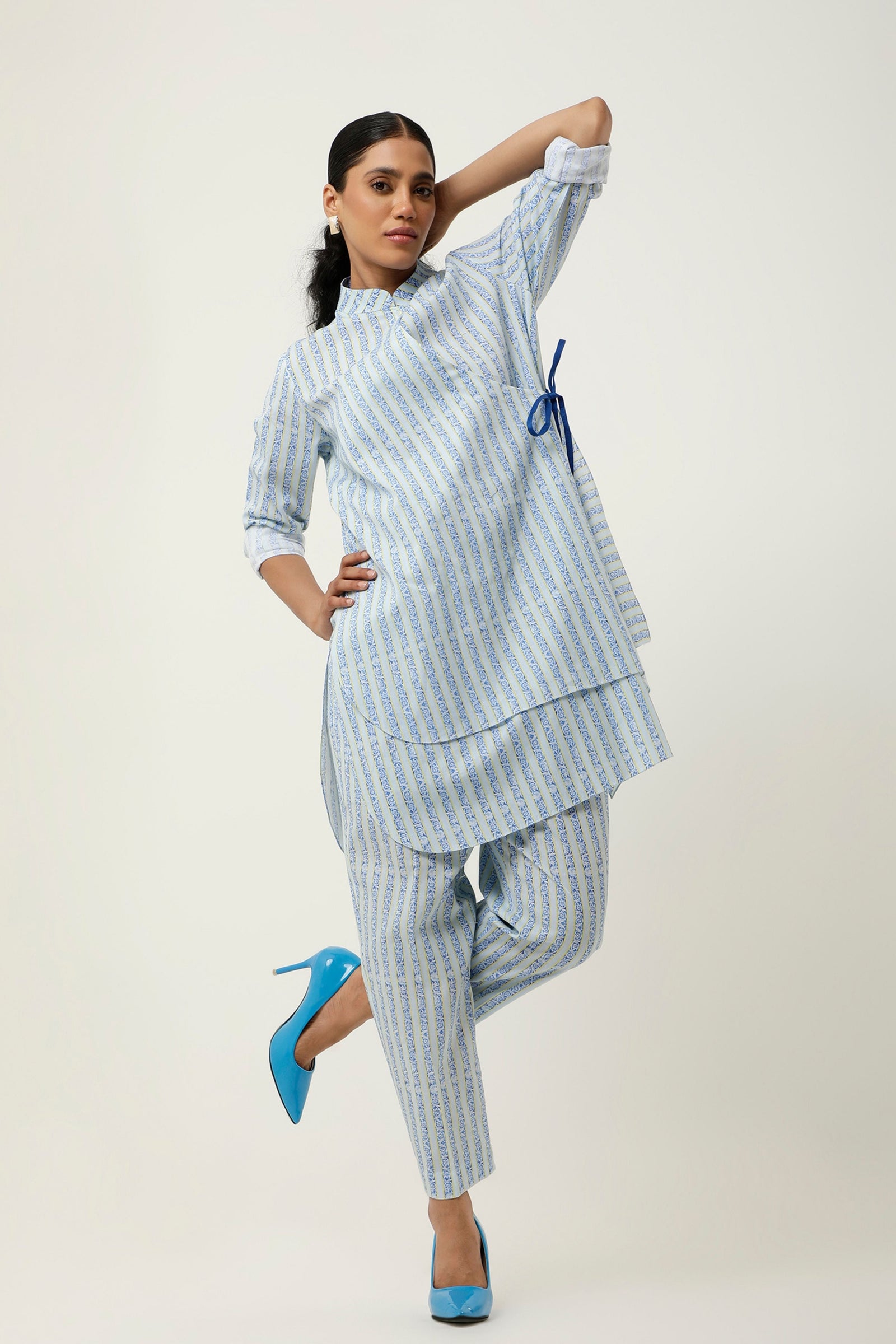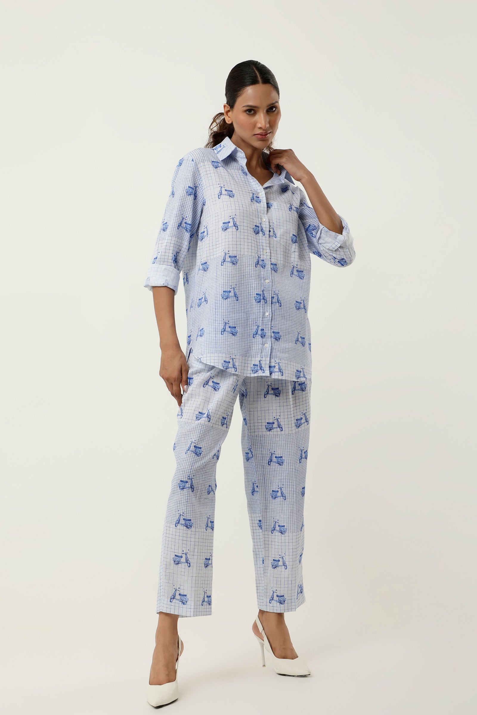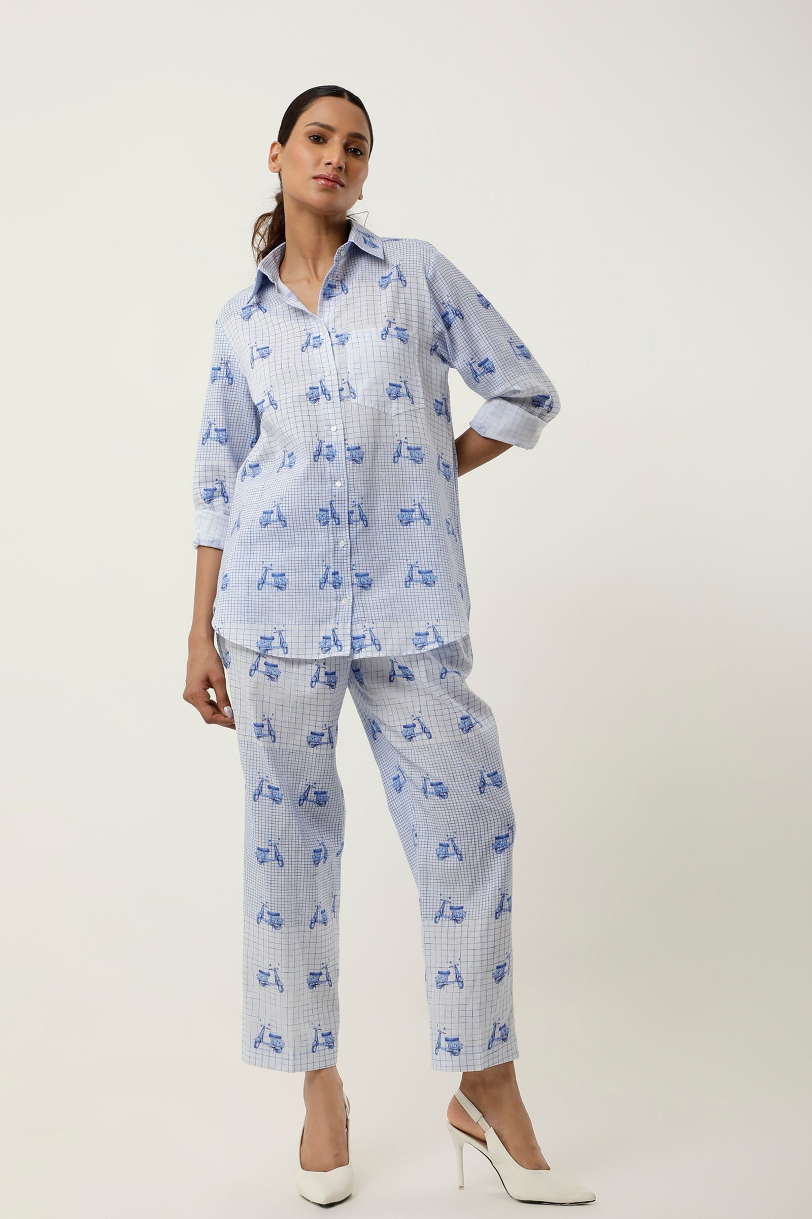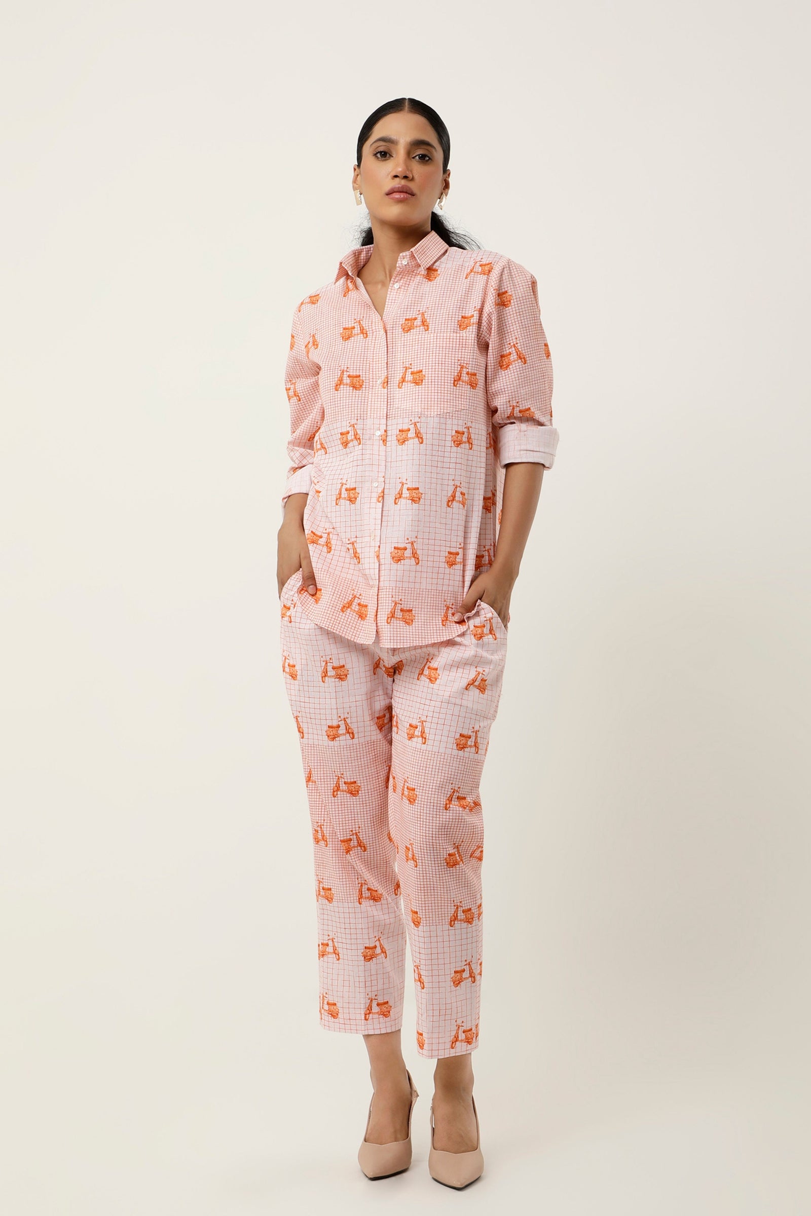 • Asymmetrical scooter printed chanderi shirt with pants and inner