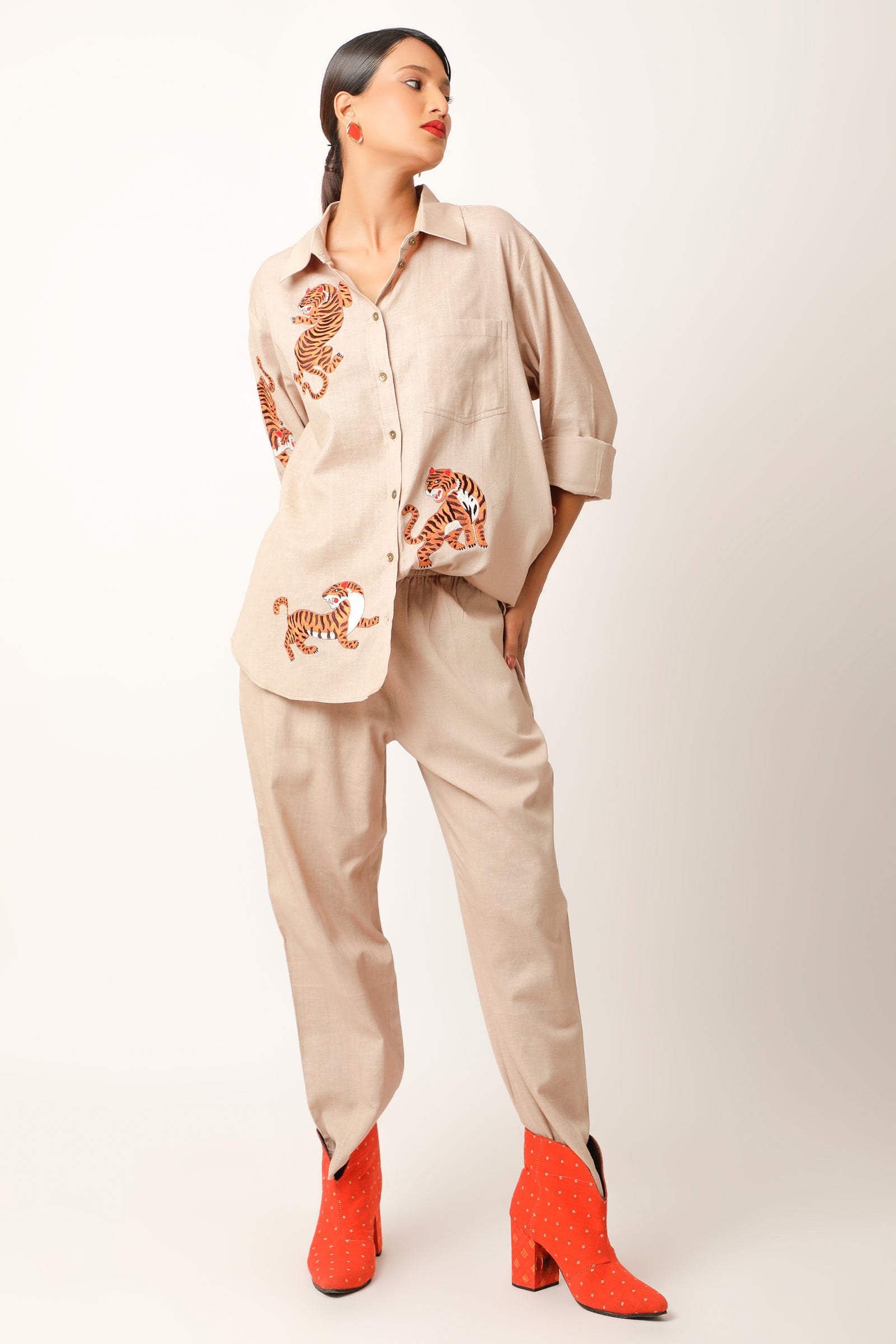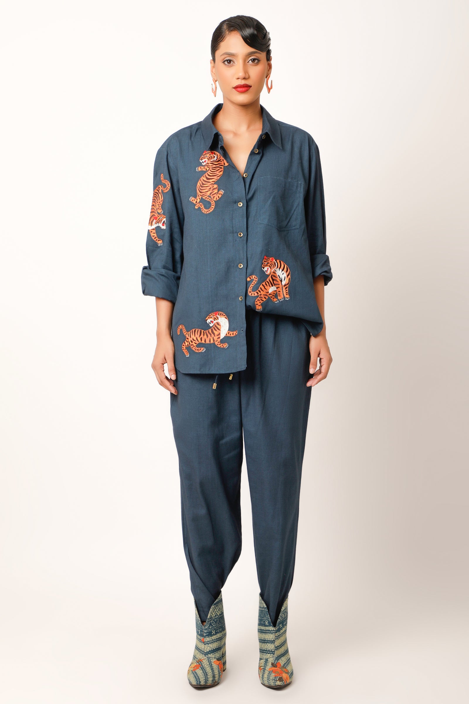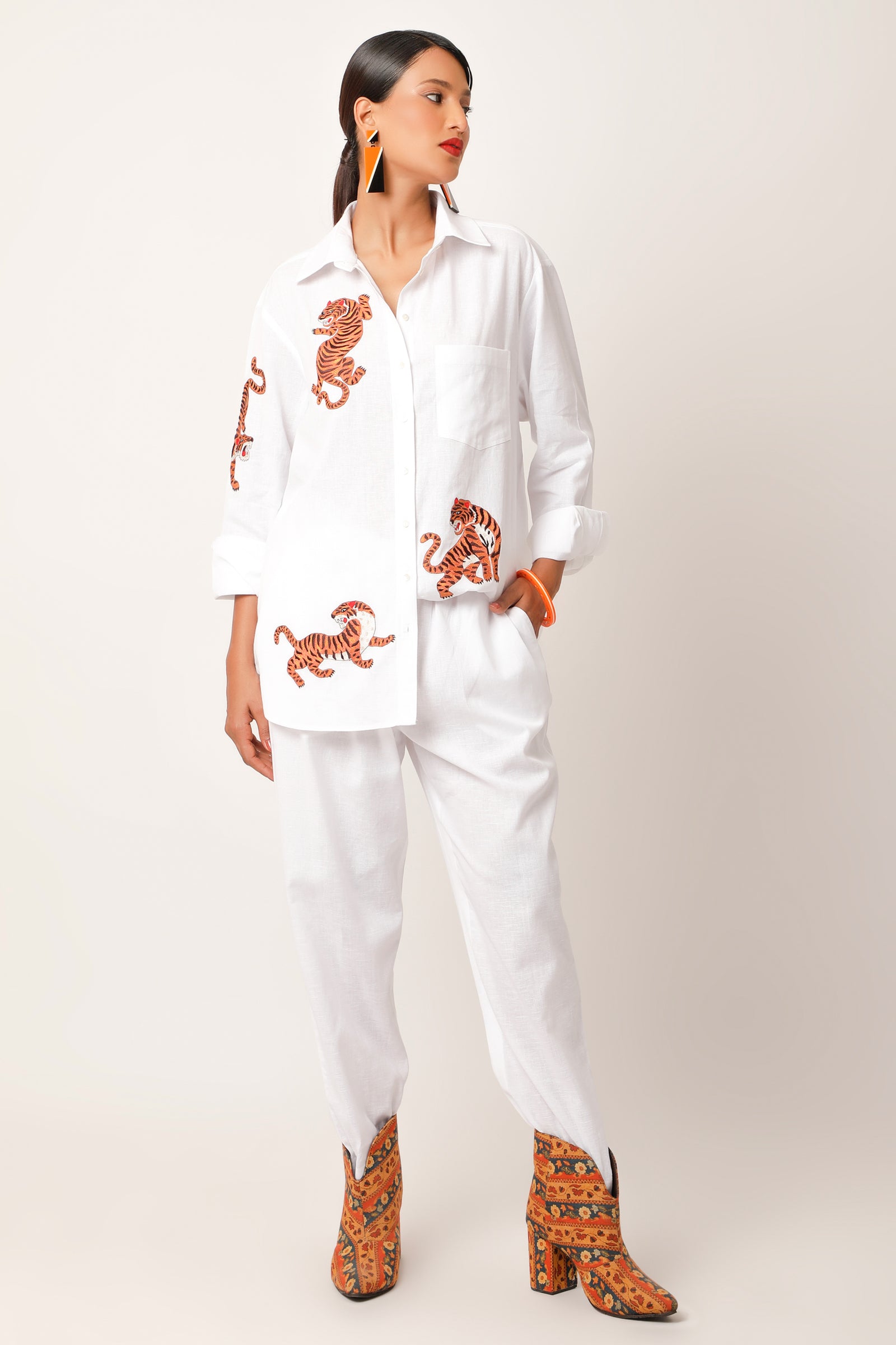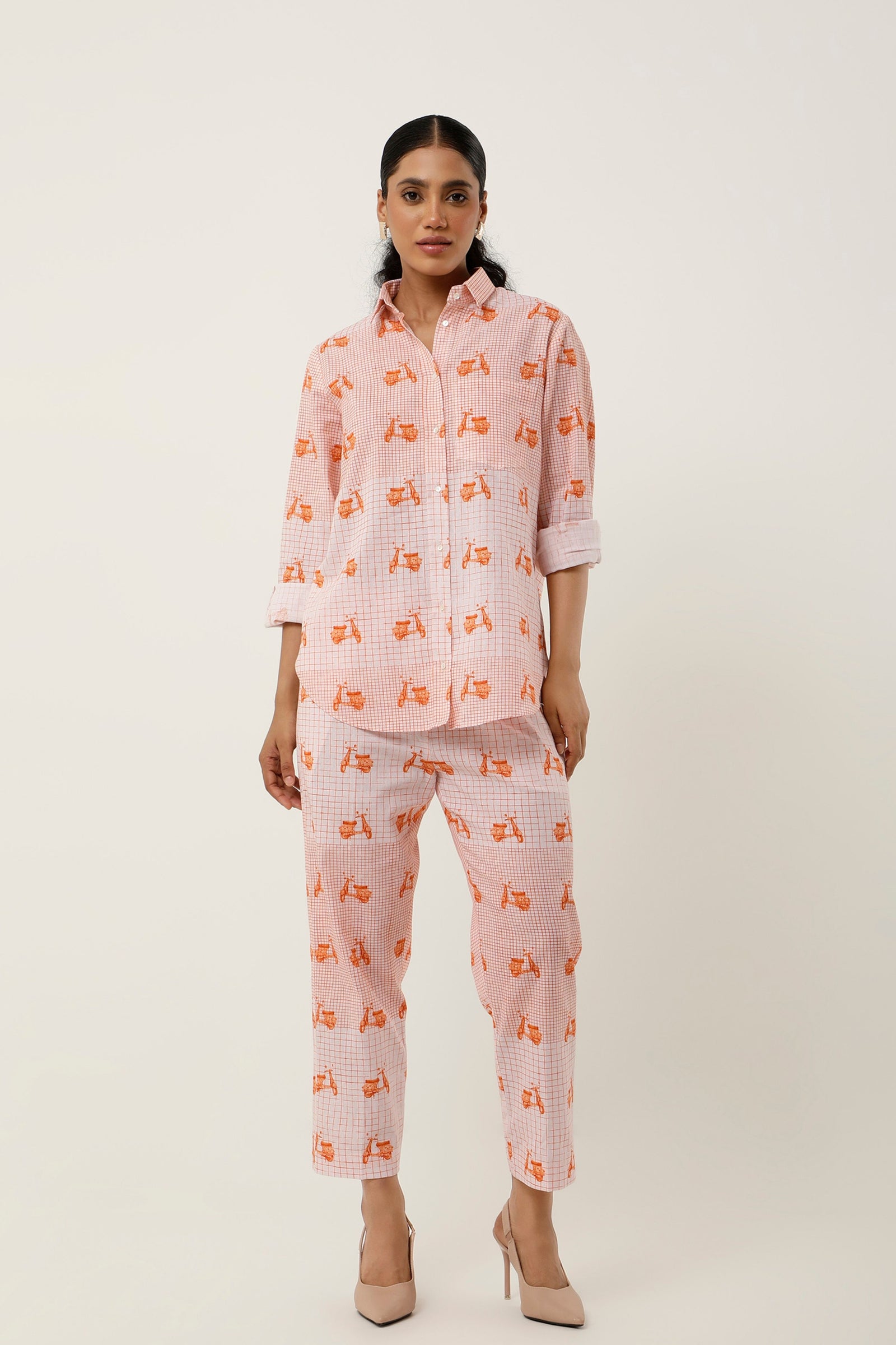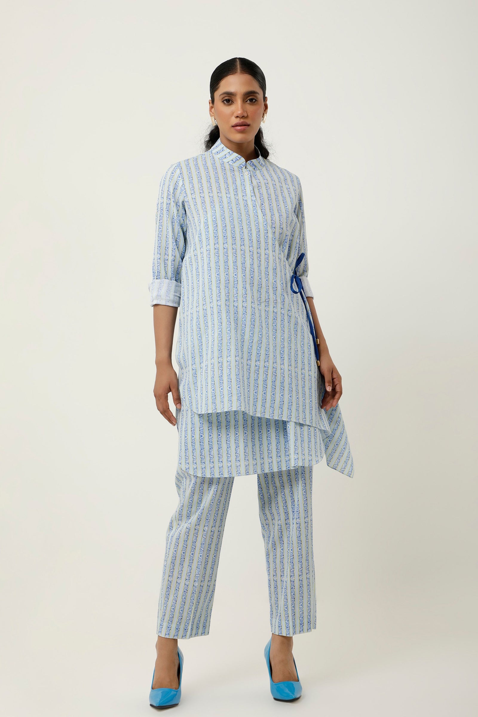 • Asymmetrical scooter printed chanderi shirt with pants and inner