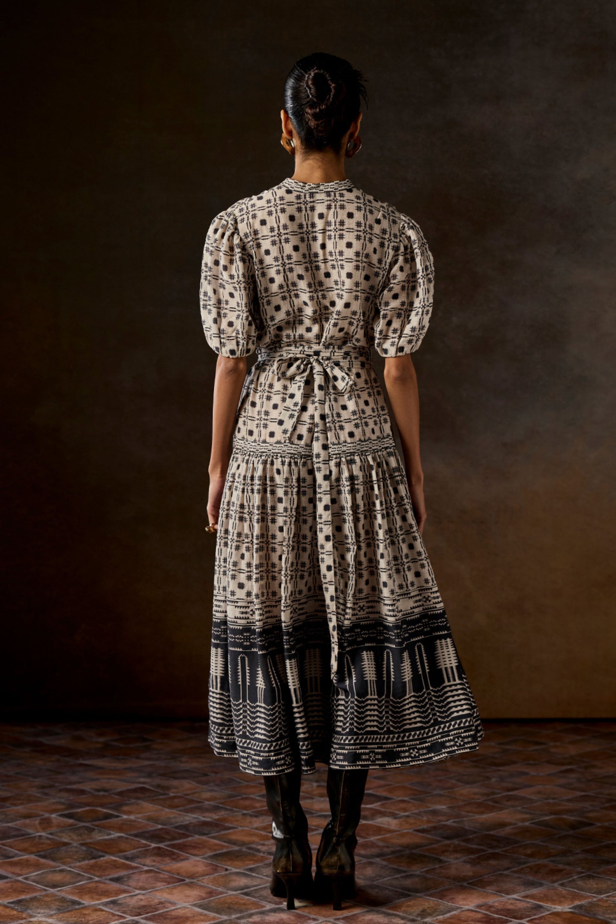 • Our ivory printed dress is crafted in airy viscose linen and features a weave draft-inspired print. Accentuated with soft puff sleeves and a matching tie belt, the dress falls into a tiered skirt panel for an easy yet elevated fit.