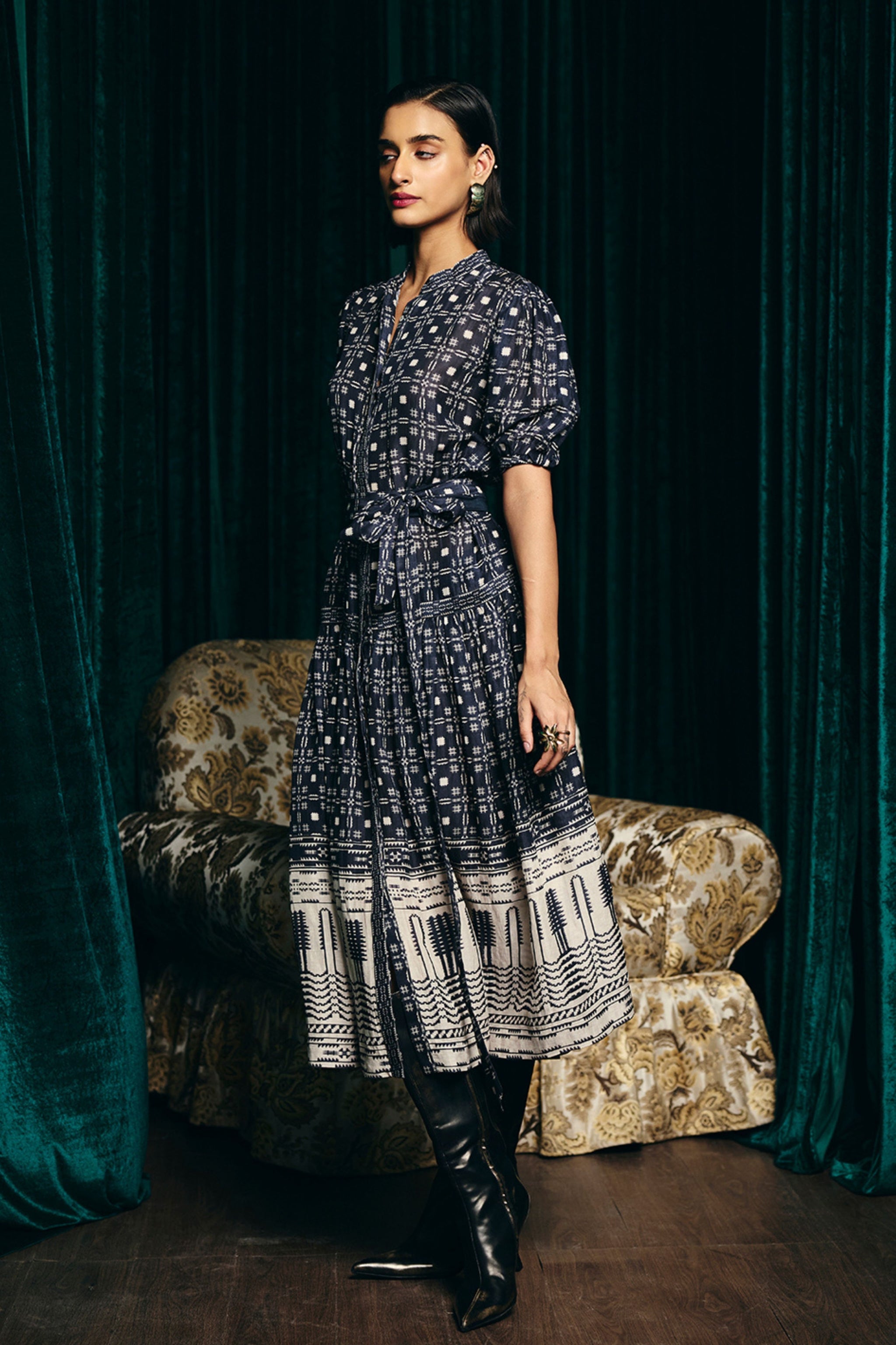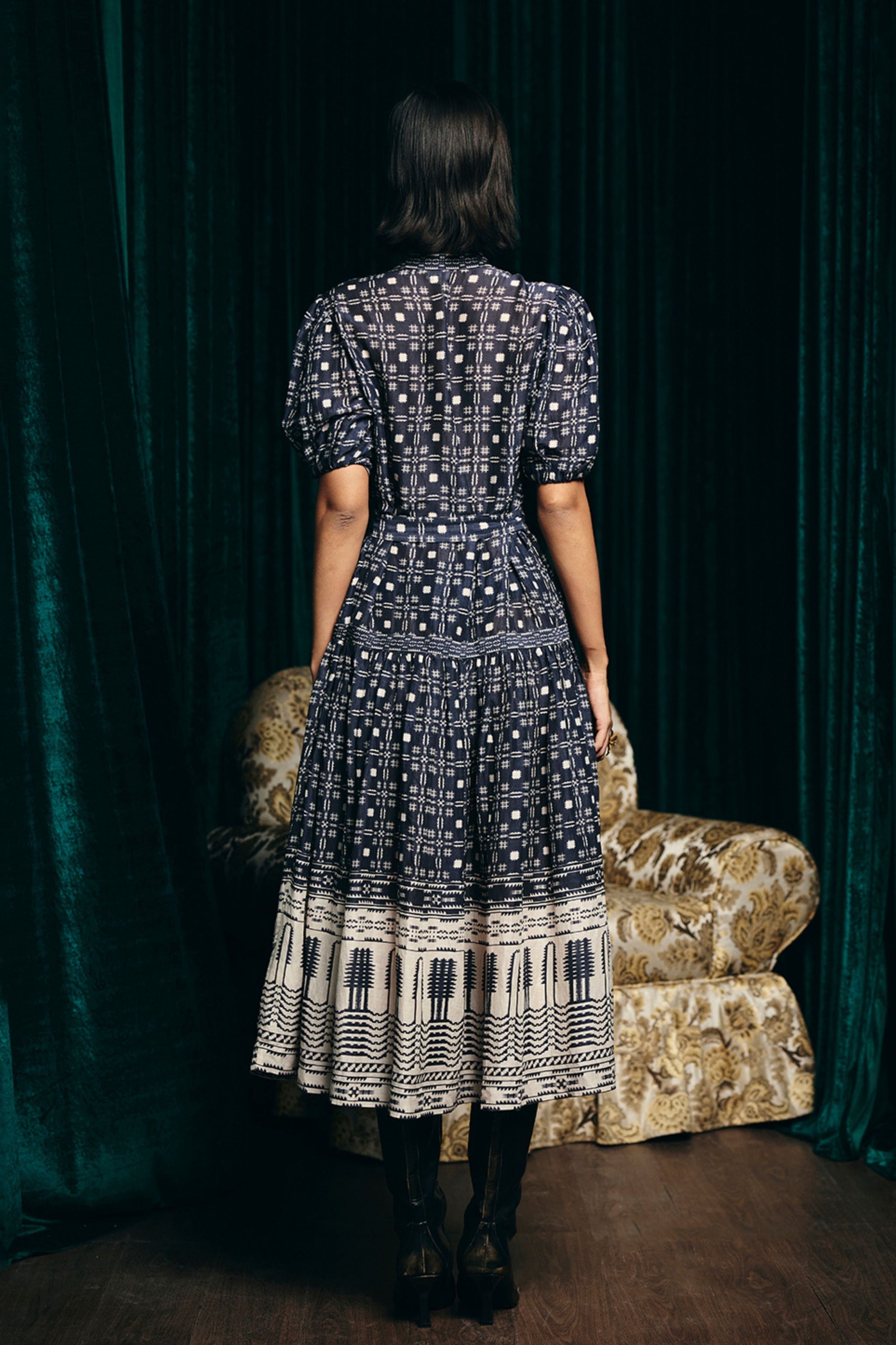 • Our navy printed dress is crafted in airy viscose linen and features a weave draft-inspired print. Accentuated with soft puff sleeves and a matching tie belt, the dress falls into a tiered skirt panel for an easy yet elevated fit.