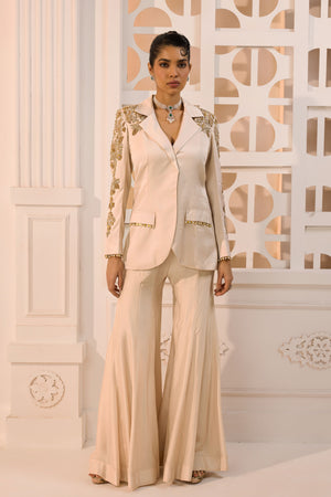 • This sophisticated cream power suit features a tailored blazer meticulously adorned with gold leaf-inspired hand embroidery on the shoulders and sleeves. Paired with dramatic, floor-sweeping flared trousers, it redefines modern occasion wear with a silhouette that is both sharp and ethereal.