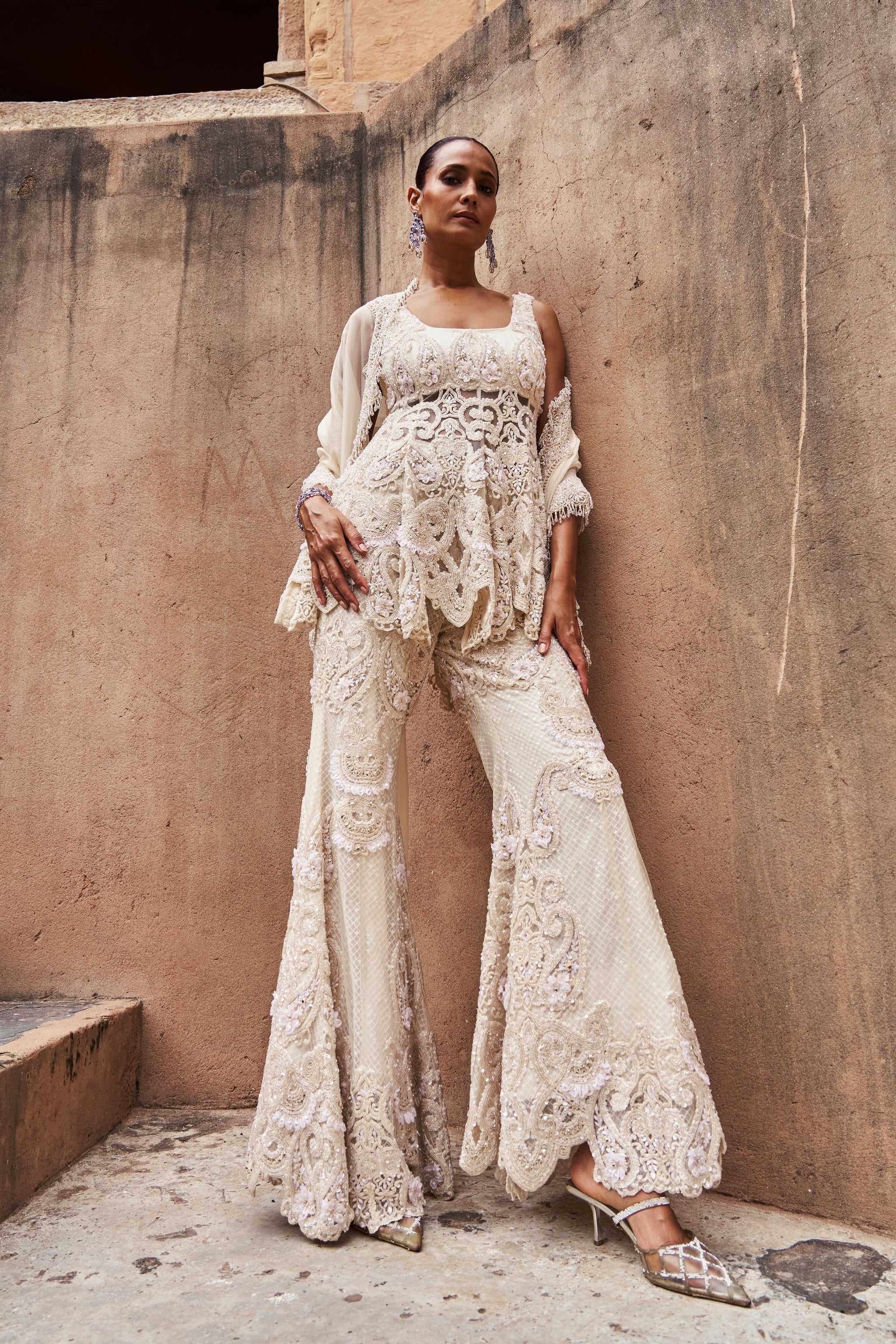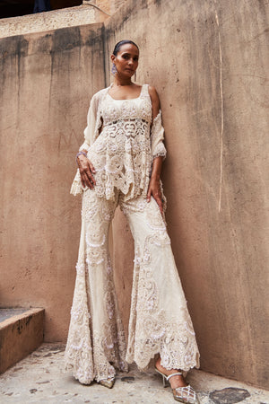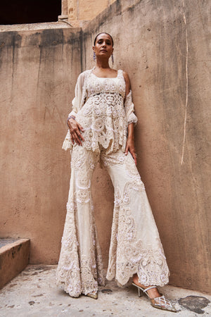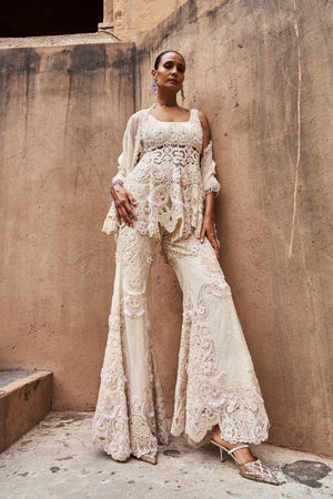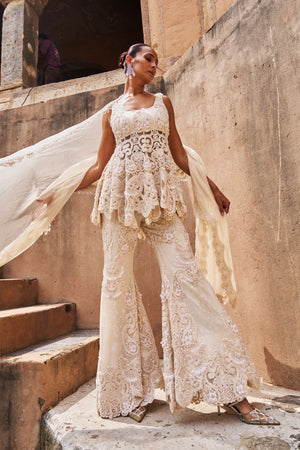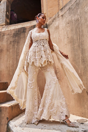 • An ivory peplum set that exudes modern elegance, featuring intricate hand embroidery and subtly textured fabric for added depth and sophistication. The coordinated peplum and pants are paired with a gracefully draped dupatta, completing the look. This ensemble strikes the perfect balance between contemporary charm and traditional craftsmanship.