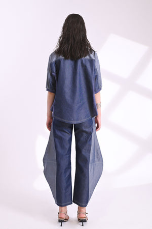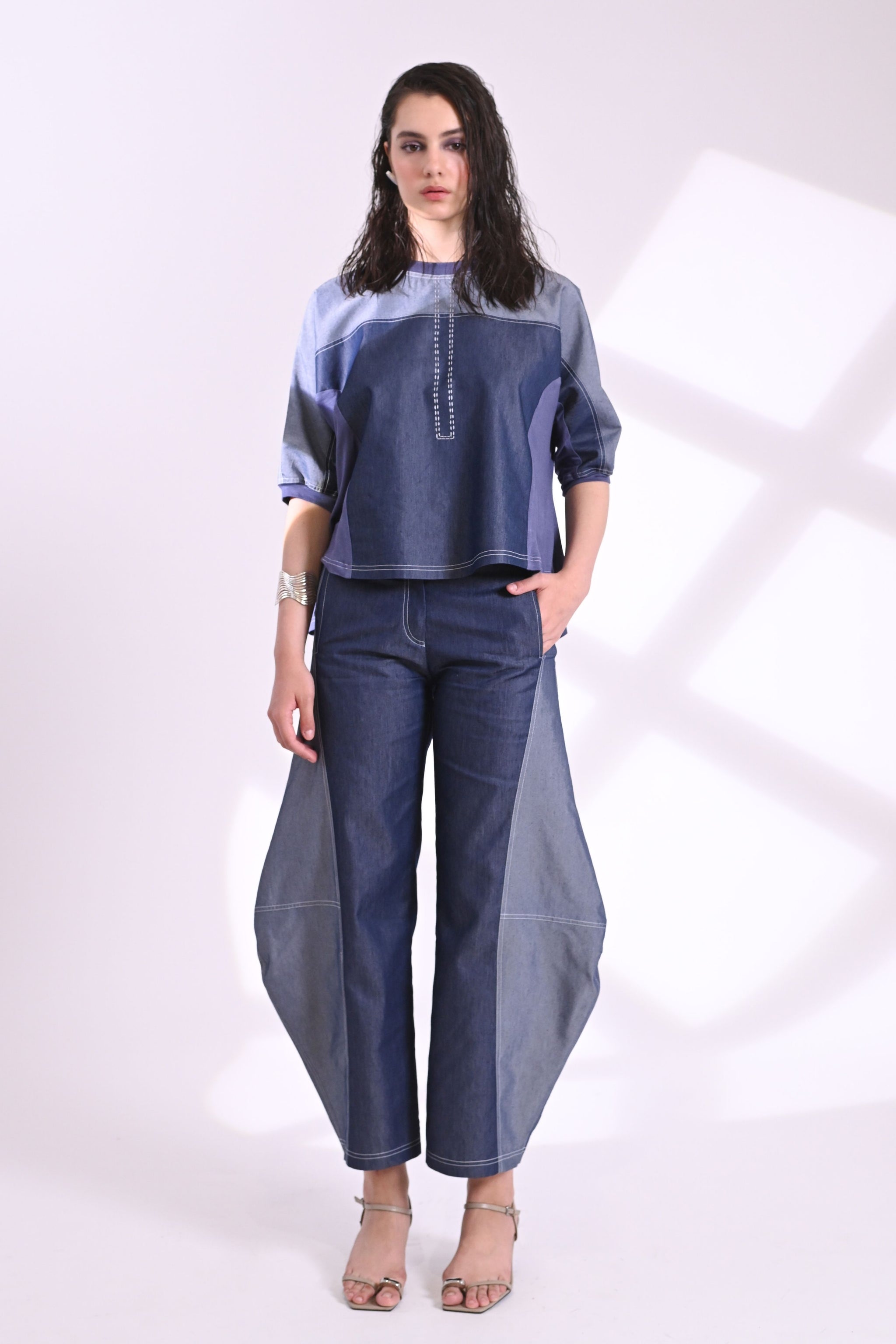 • A modern take on denim, this boxy top features a mix of blue tones, contrast paneling, and raw edges. Wide sleeves and a relaxed fit add effortless charm, while embroidered details elevate its artisanal appeal.