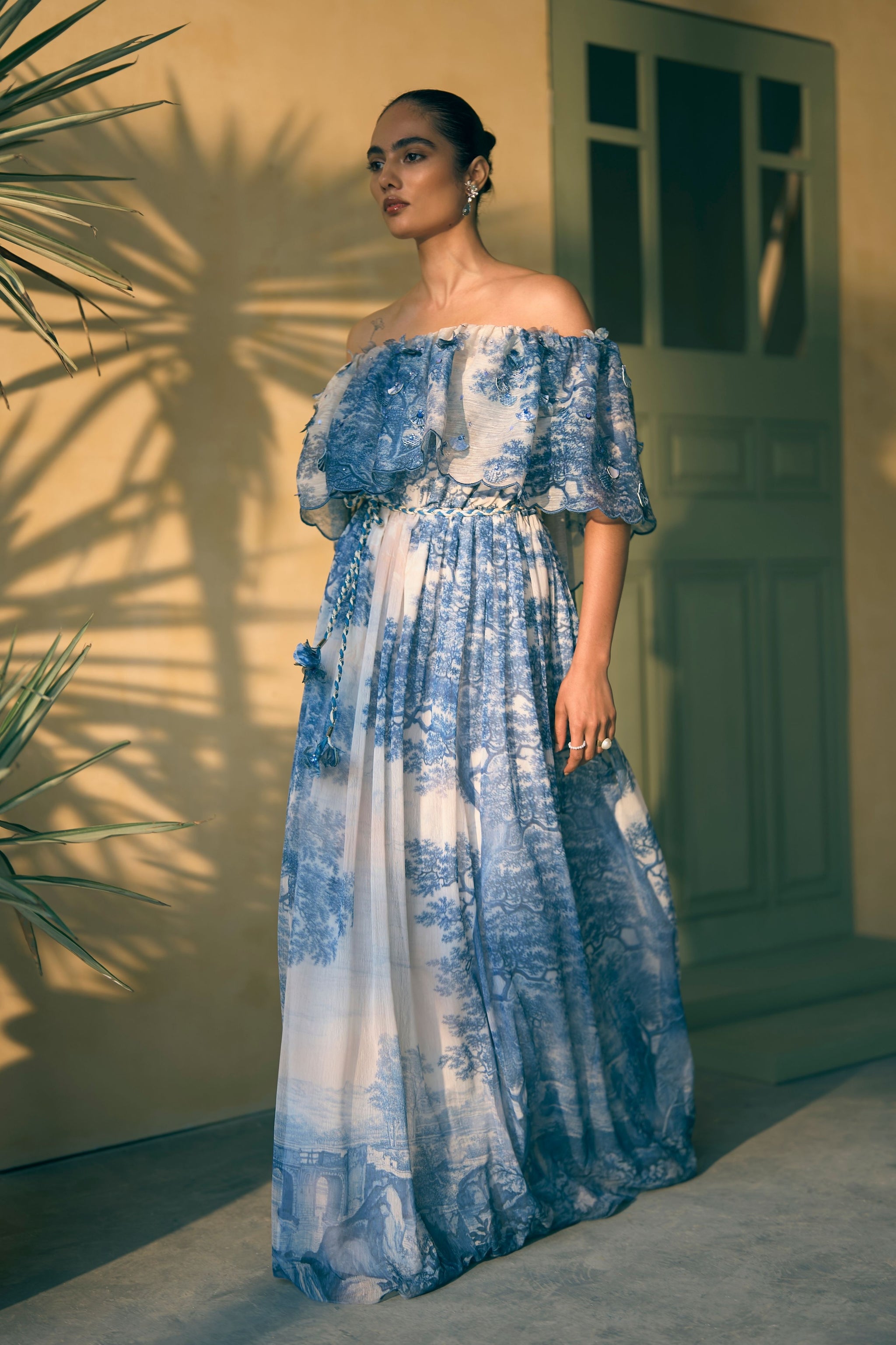 • This off-shoulder maxi dress features a timeless blue-and-ivory print on flowing, lightweight fabric. The design is elevated by a tiered, ruffled bodice with scalloped edges and delicate 3d floral embellishments, finished with a braided tassel belt to define the waist. Model is 5ft 7'' and is wearing size small. Dress length - 54 inches.