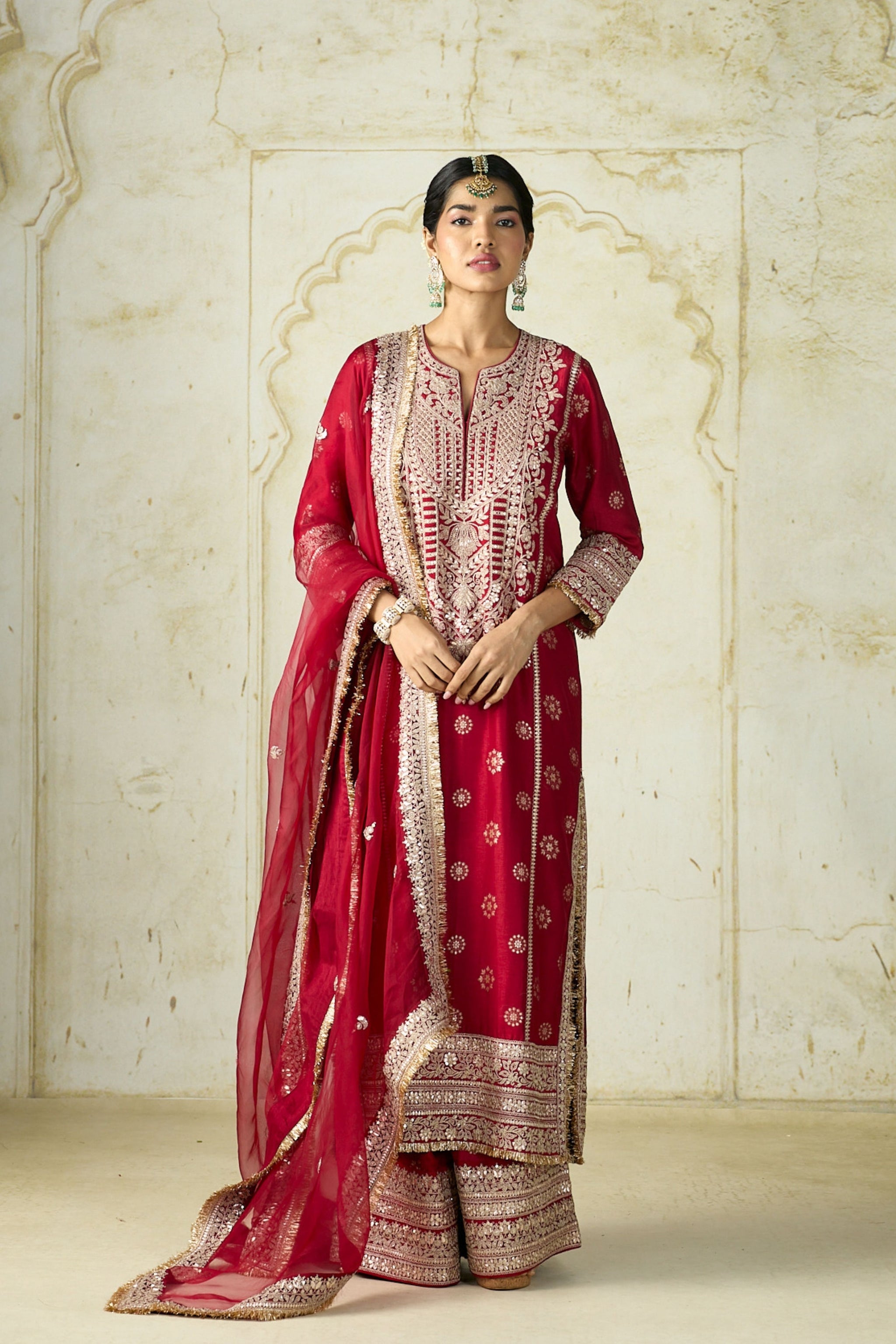 • This regal ensemble features a beautifully embroidered kurta adorned with intricate detailed motifs across the neckline, sleeves, and front panel. It is paired with matching palazzo showcasing elaborate embroidered borders that add richness to the look. The sheer dupatta, enhanced with delicate scattered motifs and an ornate embroidered border, complements the outfit.