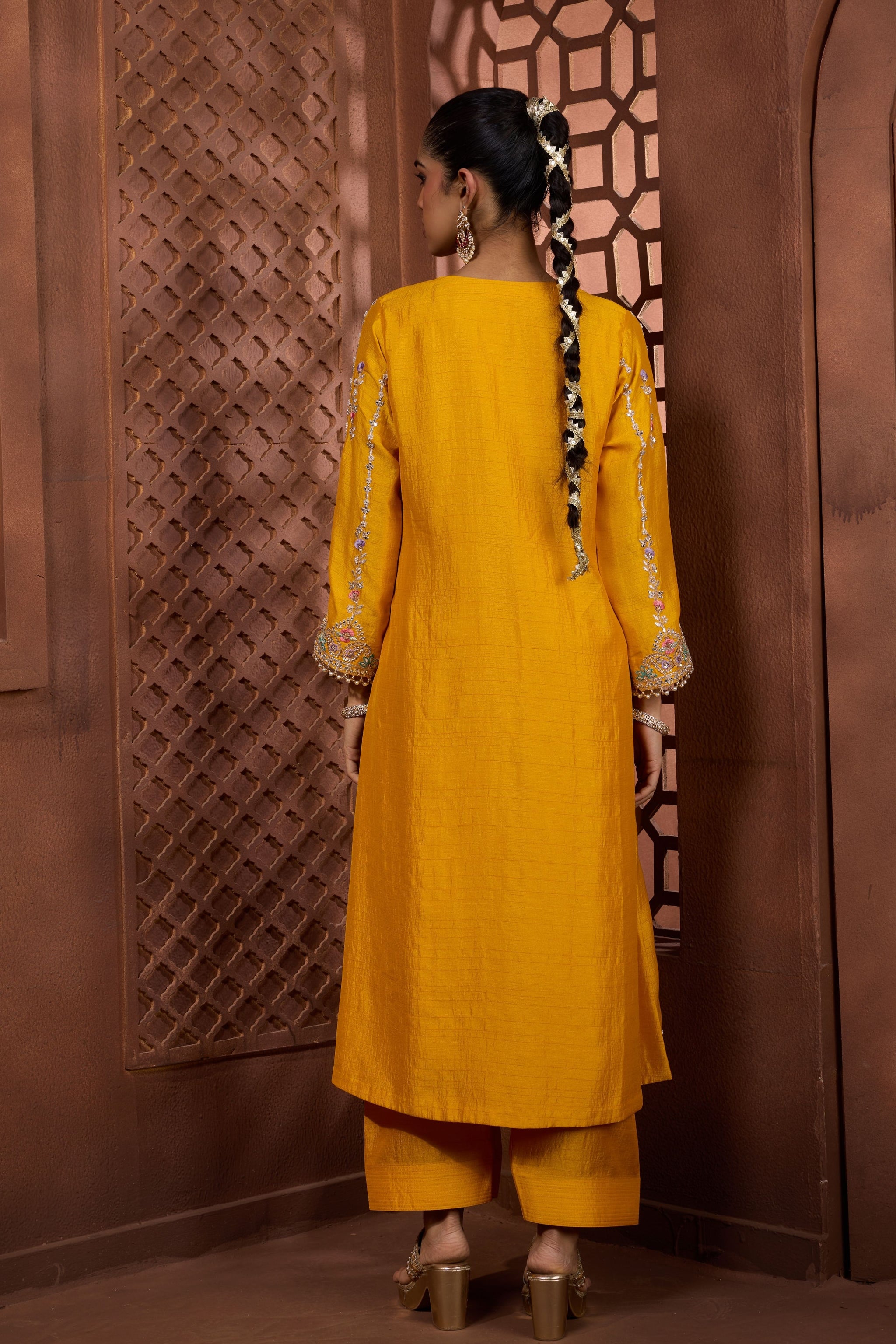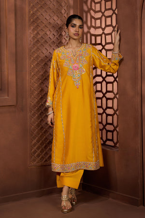 • This vibrant mustard yellow ensemble features a long-line silk kurta meticulously detailed with a colorful hand-embroidered floral yoke and vertical sequin-lined patterns. The look is grounded by matching salwar and finished with a delicate embroidered border at the hem and cuffs for a refined, celebratory aesthetic.