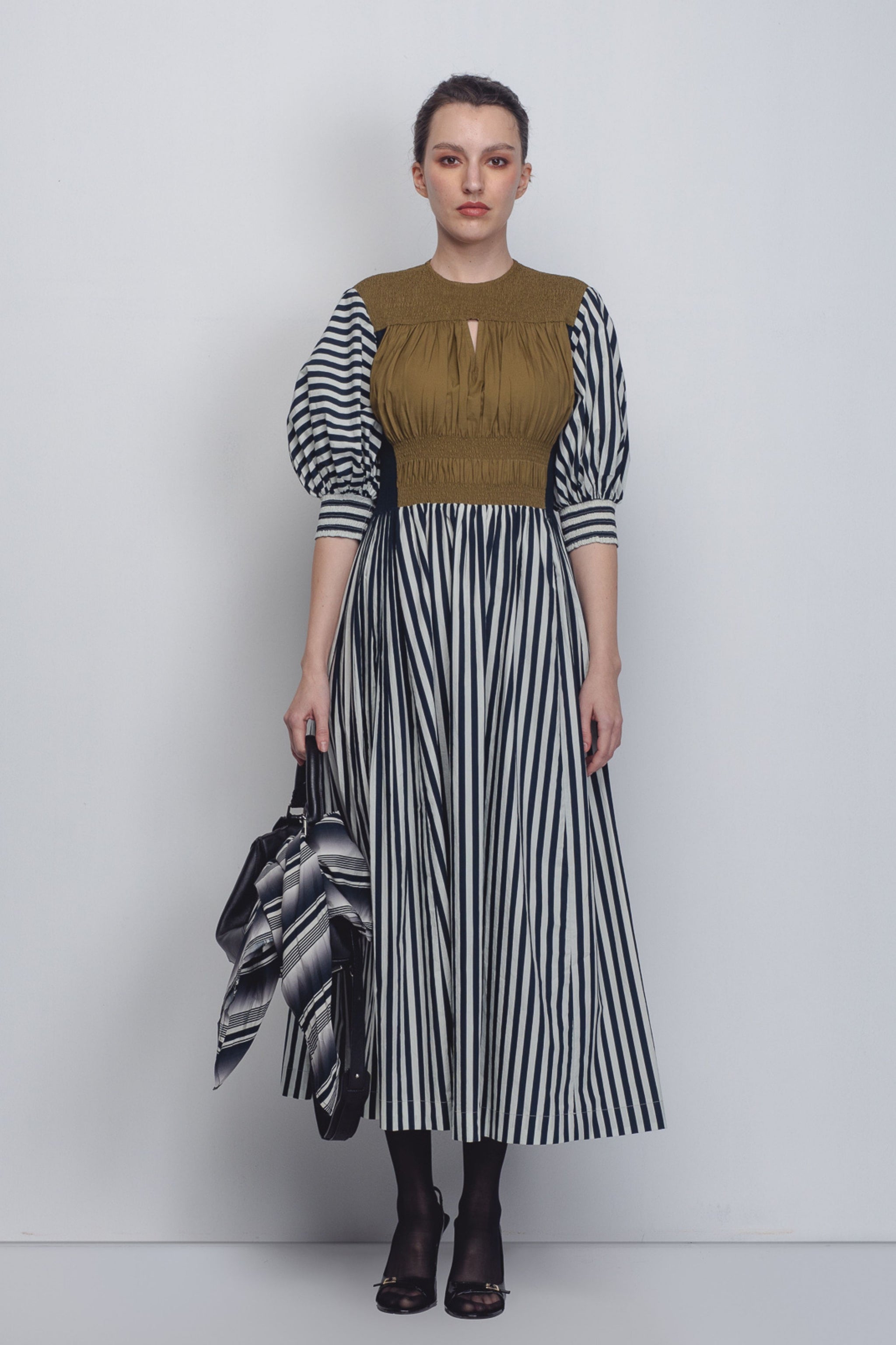 • This dress is a sophisticated exploration of texture and graphic play, combining an earth-toned olive bodice with a bold, vertical-striped skirt. The upper portion features a ruched and smocked olive panel with a subtle keyhole cutout and structured high neckline, transitioning into voluminous puffed sleeves detailed with horizontal stripes. 55