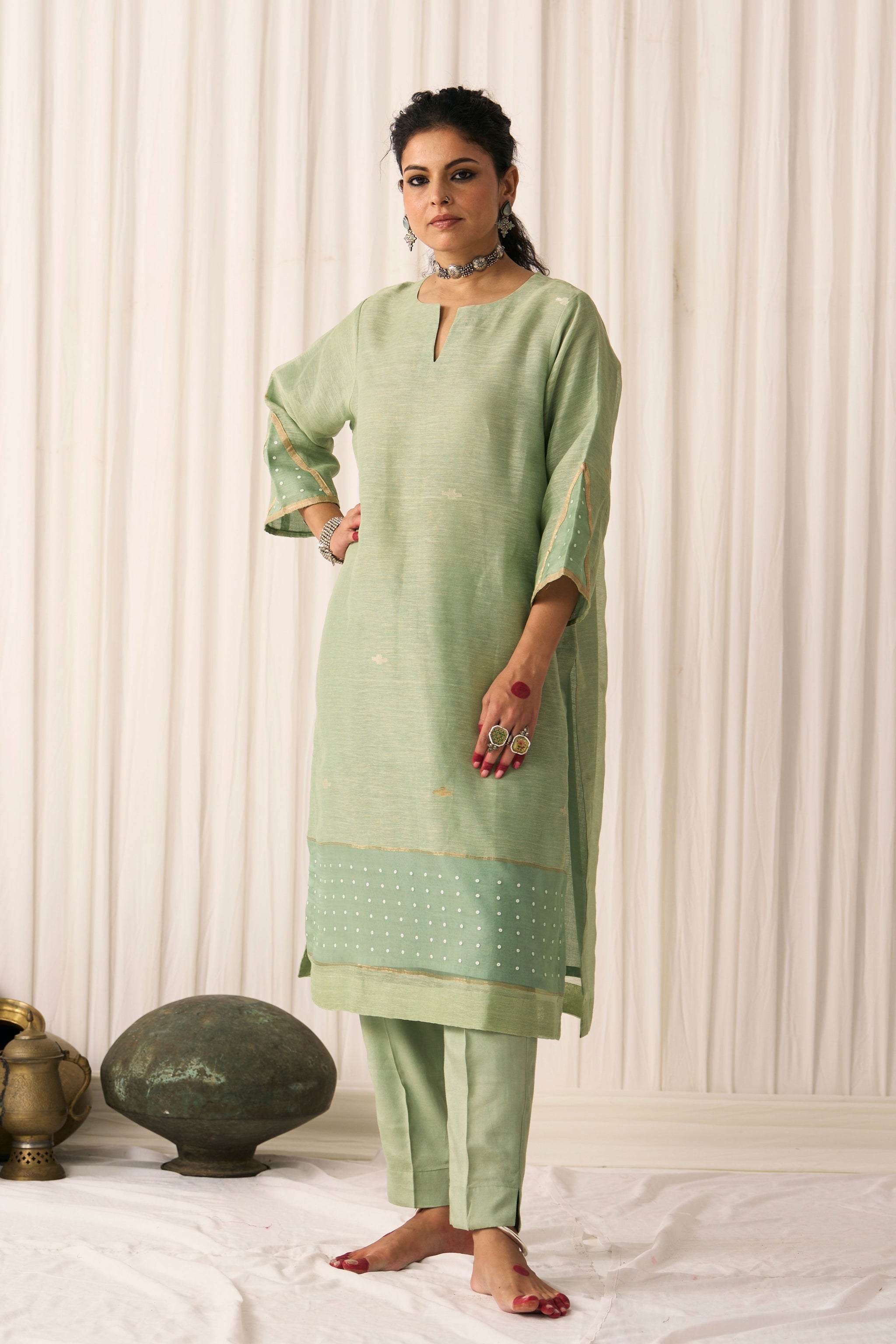 • Straight kurta with woven sequins and golden detailing, paired with relaxed fit pants with both elastic and drawstring, featuring side slits. Dupatta: mint silk linen with jamdani motif woven overall and broad organza edges with woven sequins. Kindly note that the stitched suit will be in the exact same style as worn by the model, with sufficient margin provided to size up or down if needed. The kurta length is 46 inches, the pant length is 38 inches, and the dupatta is approximately 2.5 Meters.