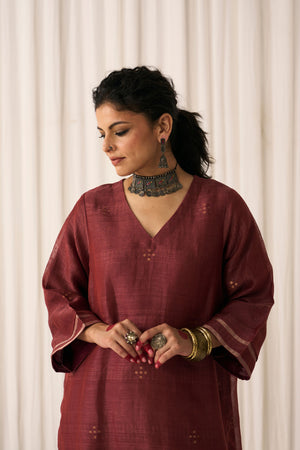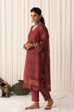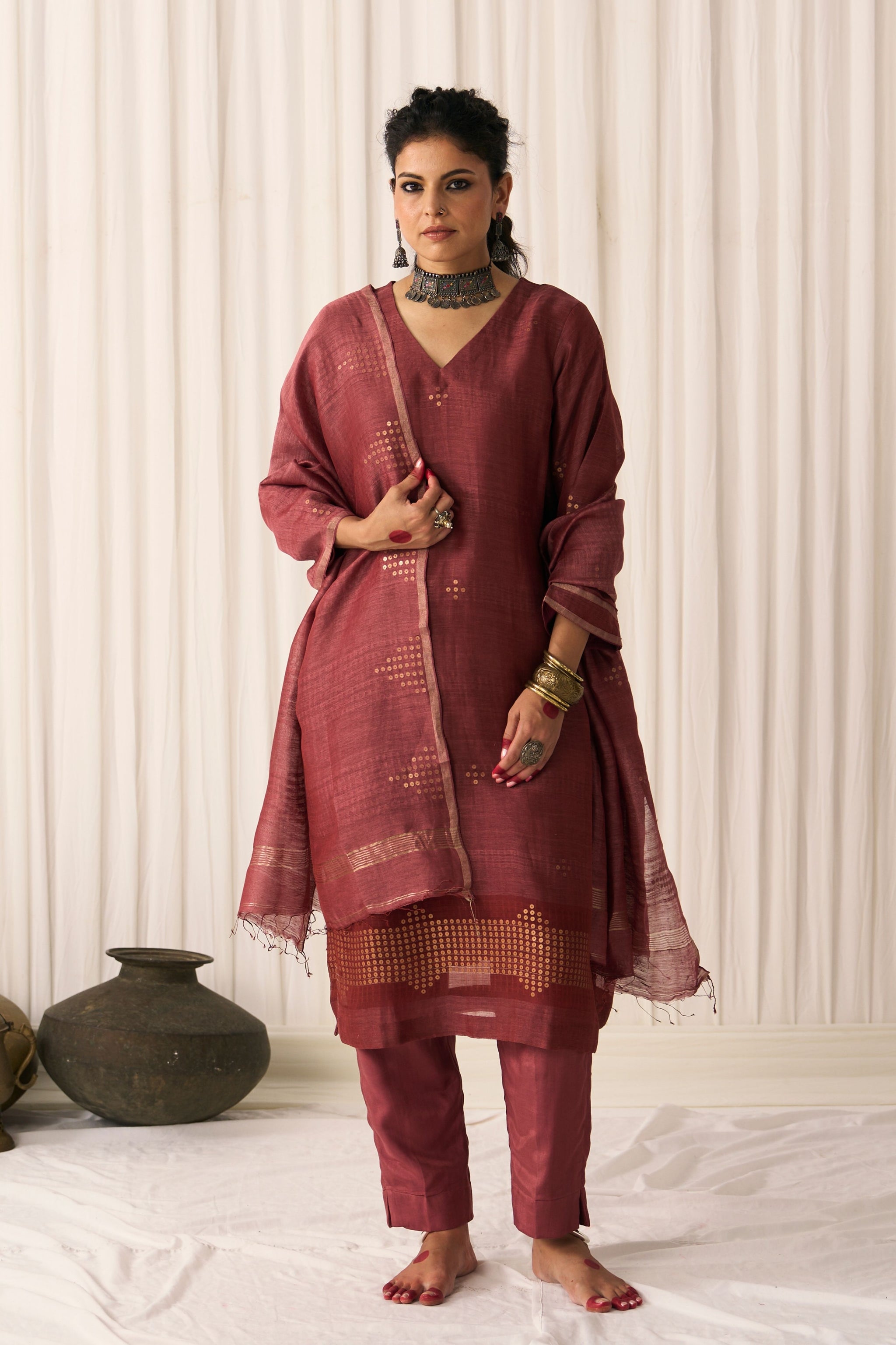 • Straight kurta with golden detailing, paired with relaxed fit pants with both elastic and drawstring. Dupatta: maroon silk linen with geometric sequins woven along the golden selvedge. Kindly note that the stitched suit will be in the exact same style as worn by the model, with sufficient margin provided to size up or down if needed. The kurta length is 46 inches, the pant length is 38 inches, and the dupatta is approximately 2.5 Meters.