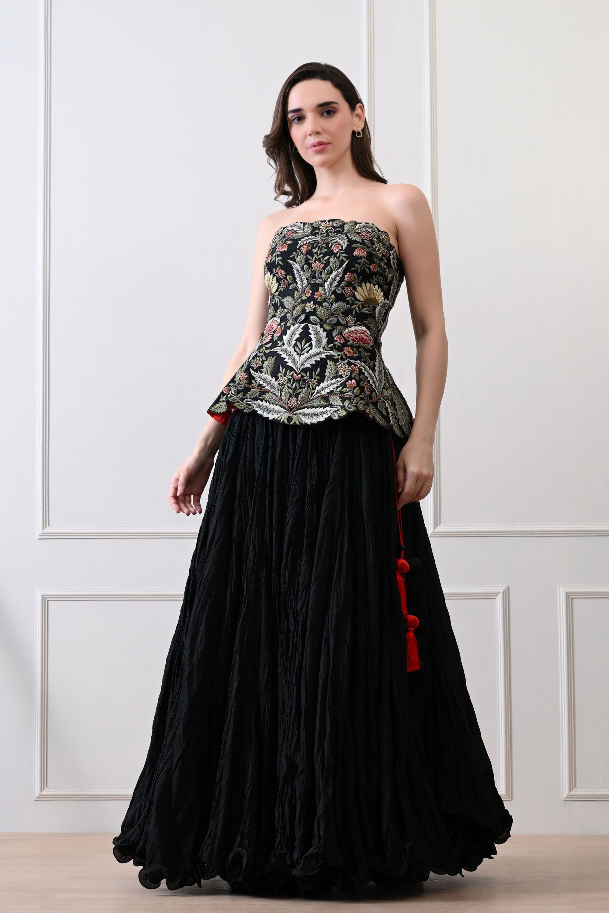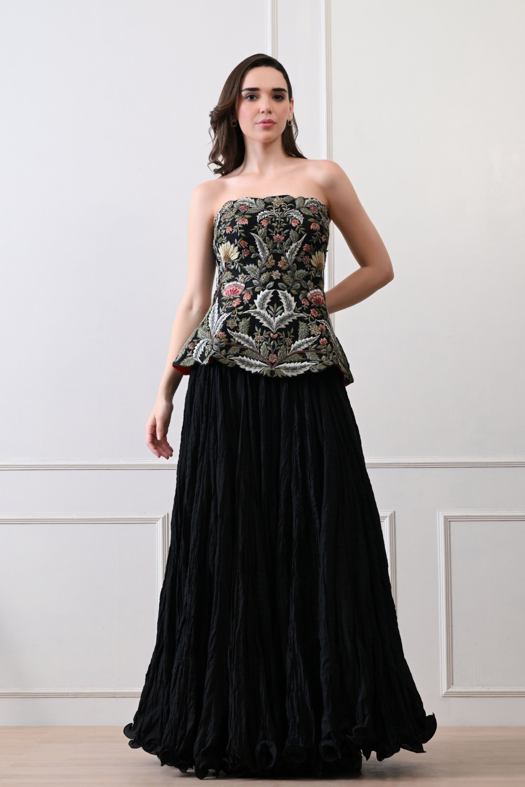• Black corset-top with intricate all-over floral embroidery, paired with a matching flowing skirt, creating a chic and elegant ensemble