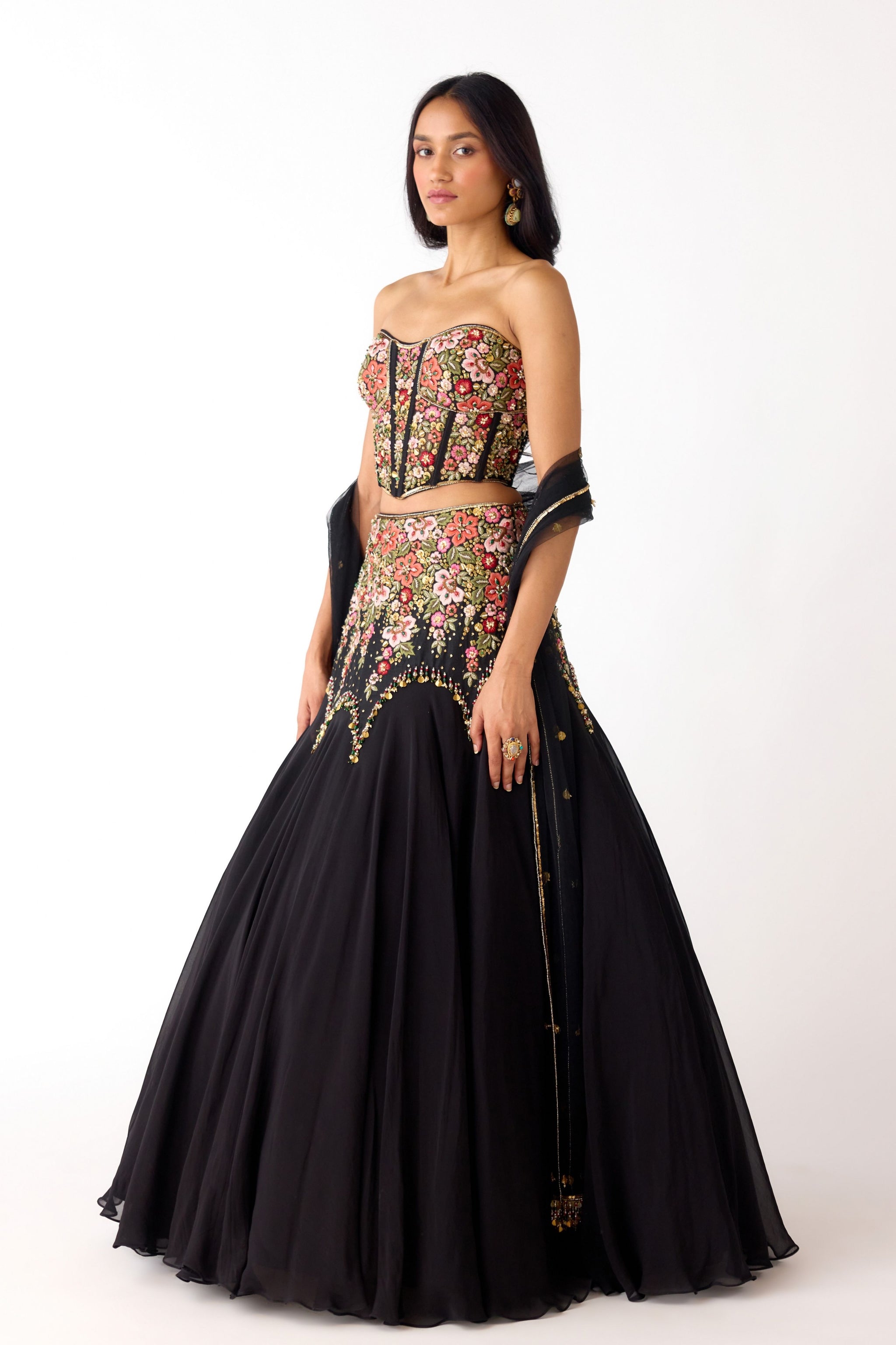 • Components: Corset Blouse, Lehenga, Dupatta (3)