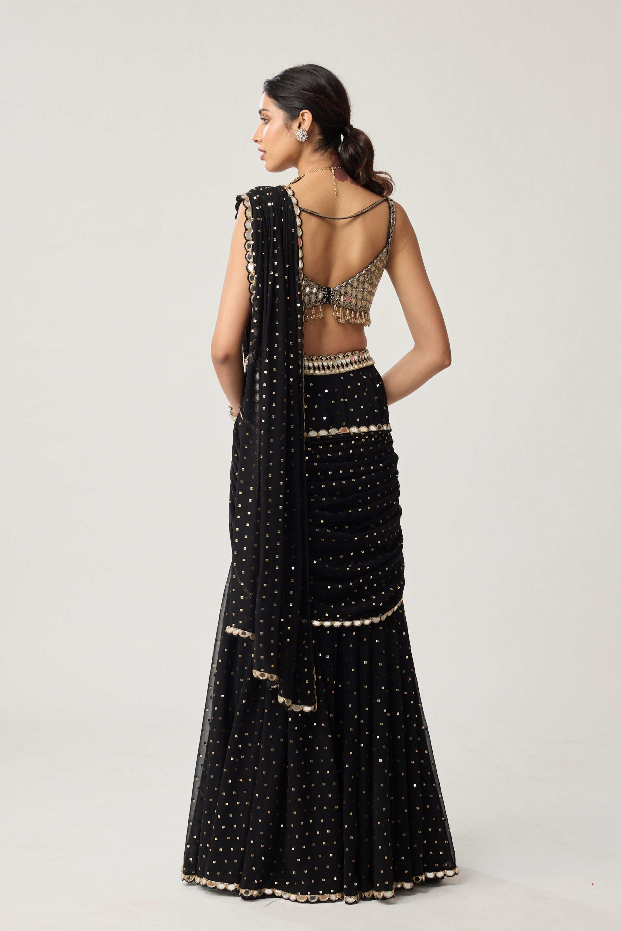 • Black georgette flared pants saree with real hand cut mirror embroidered sleeveless blouse.