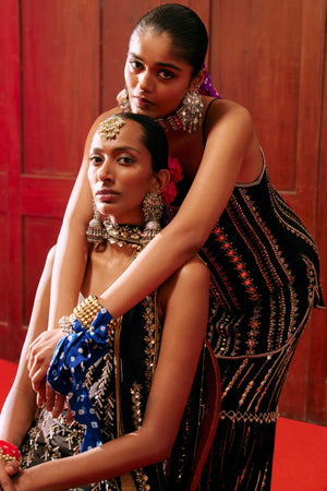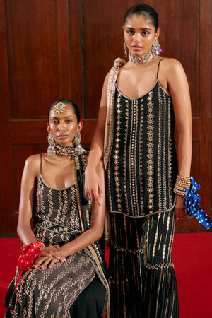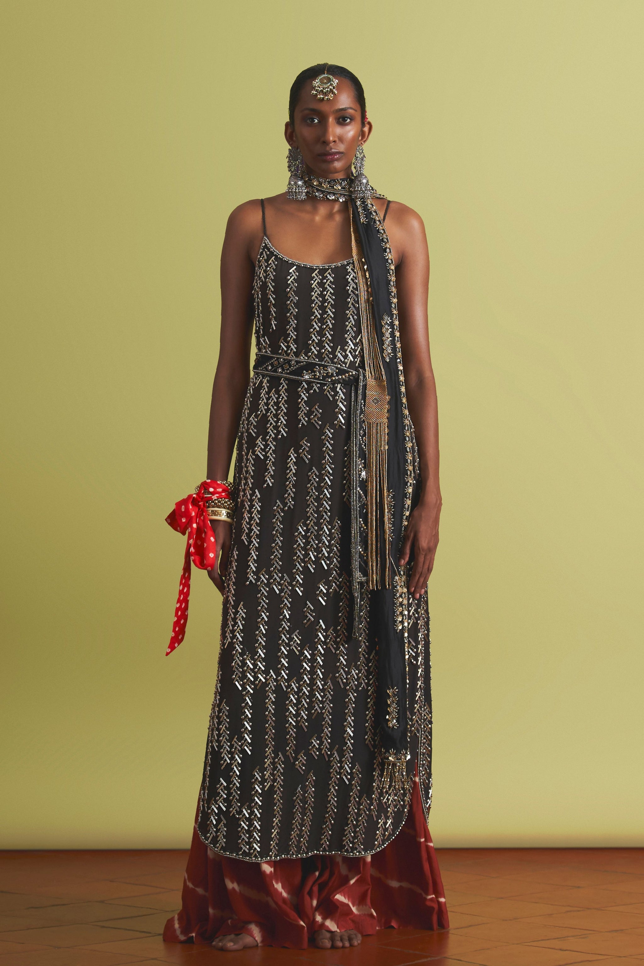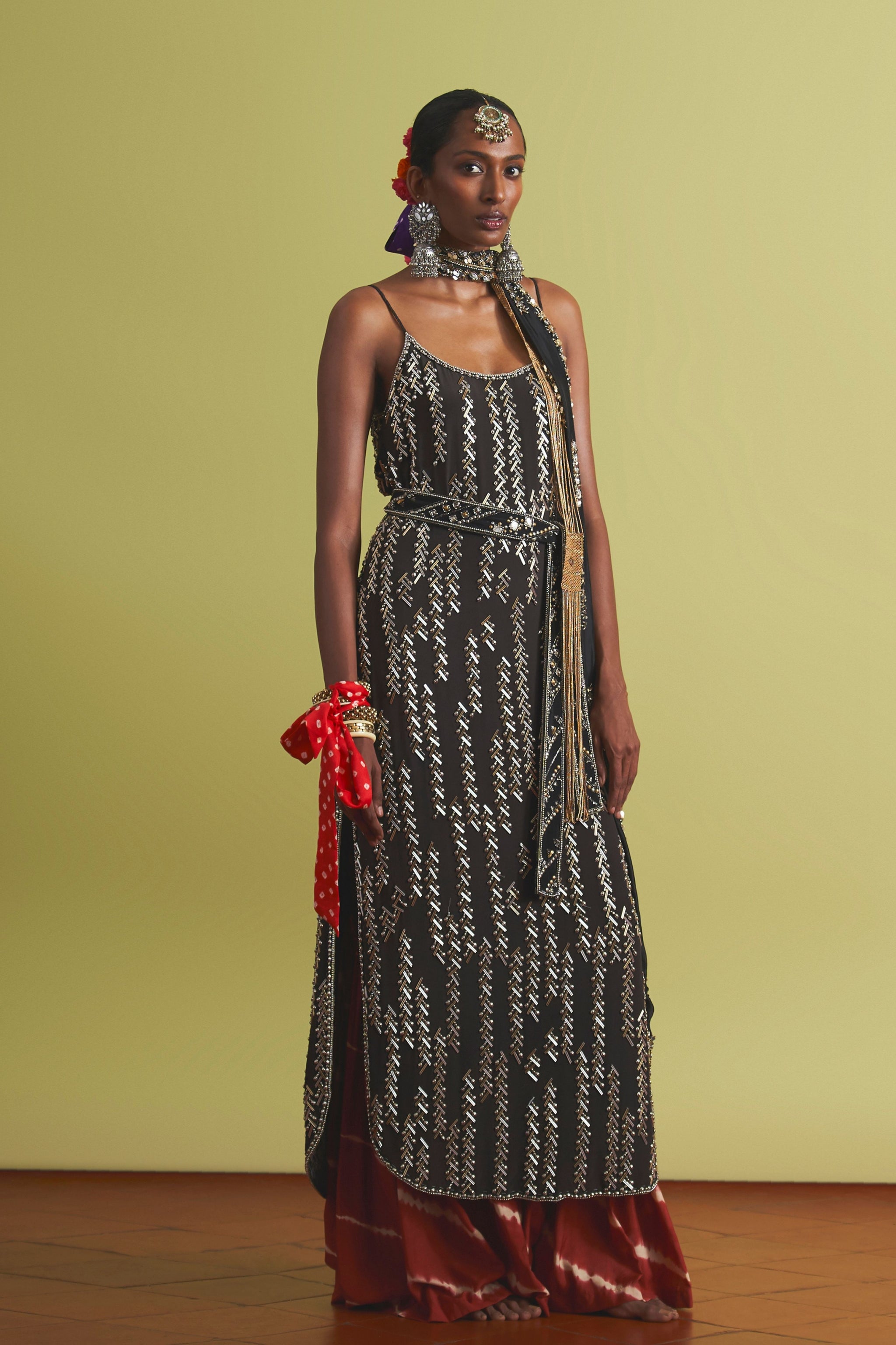 • This outfit features a black long beaded kurta, a rust leheriya gharara, a black stole, and a belt.