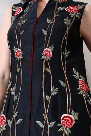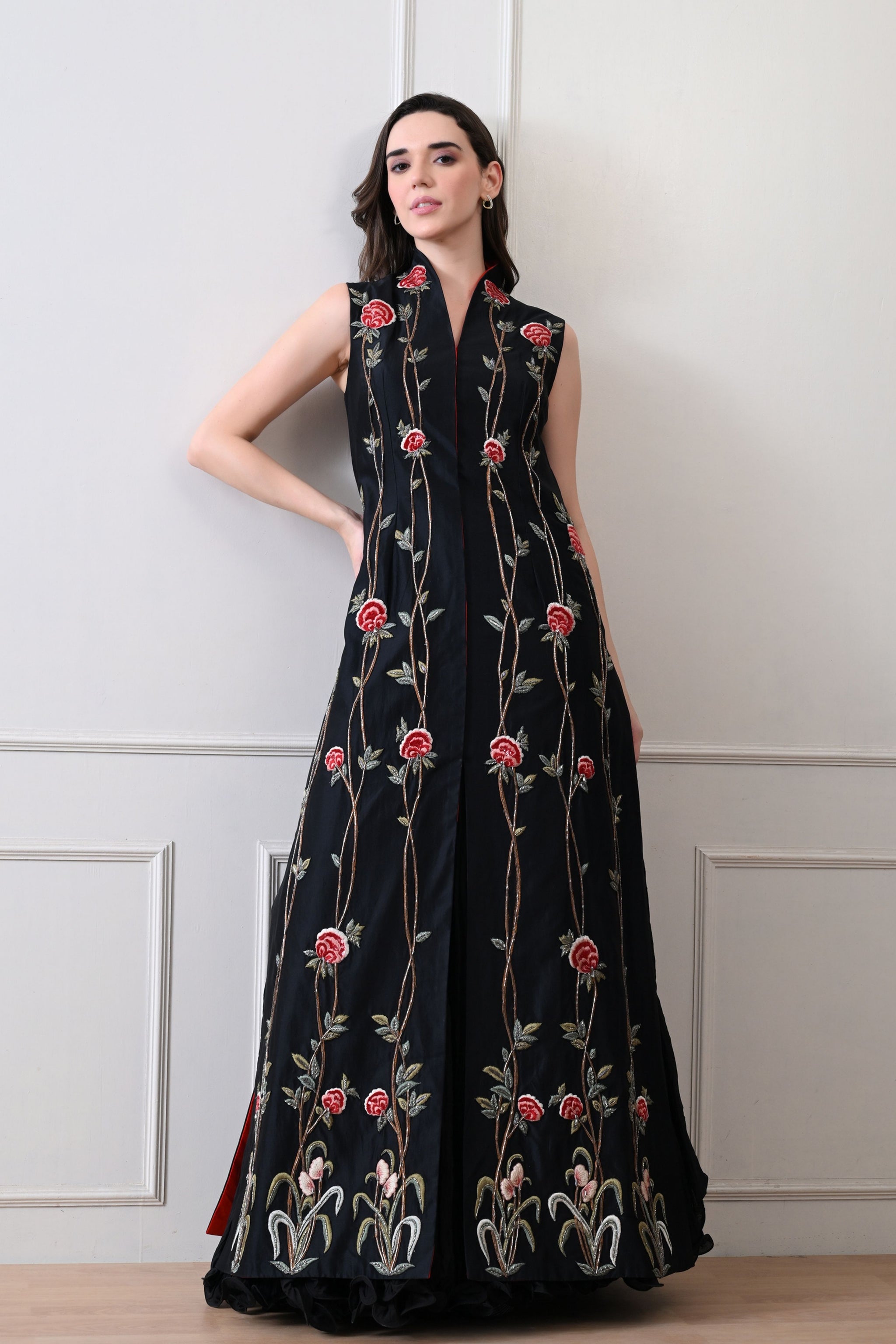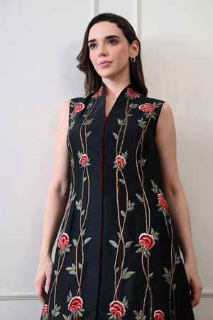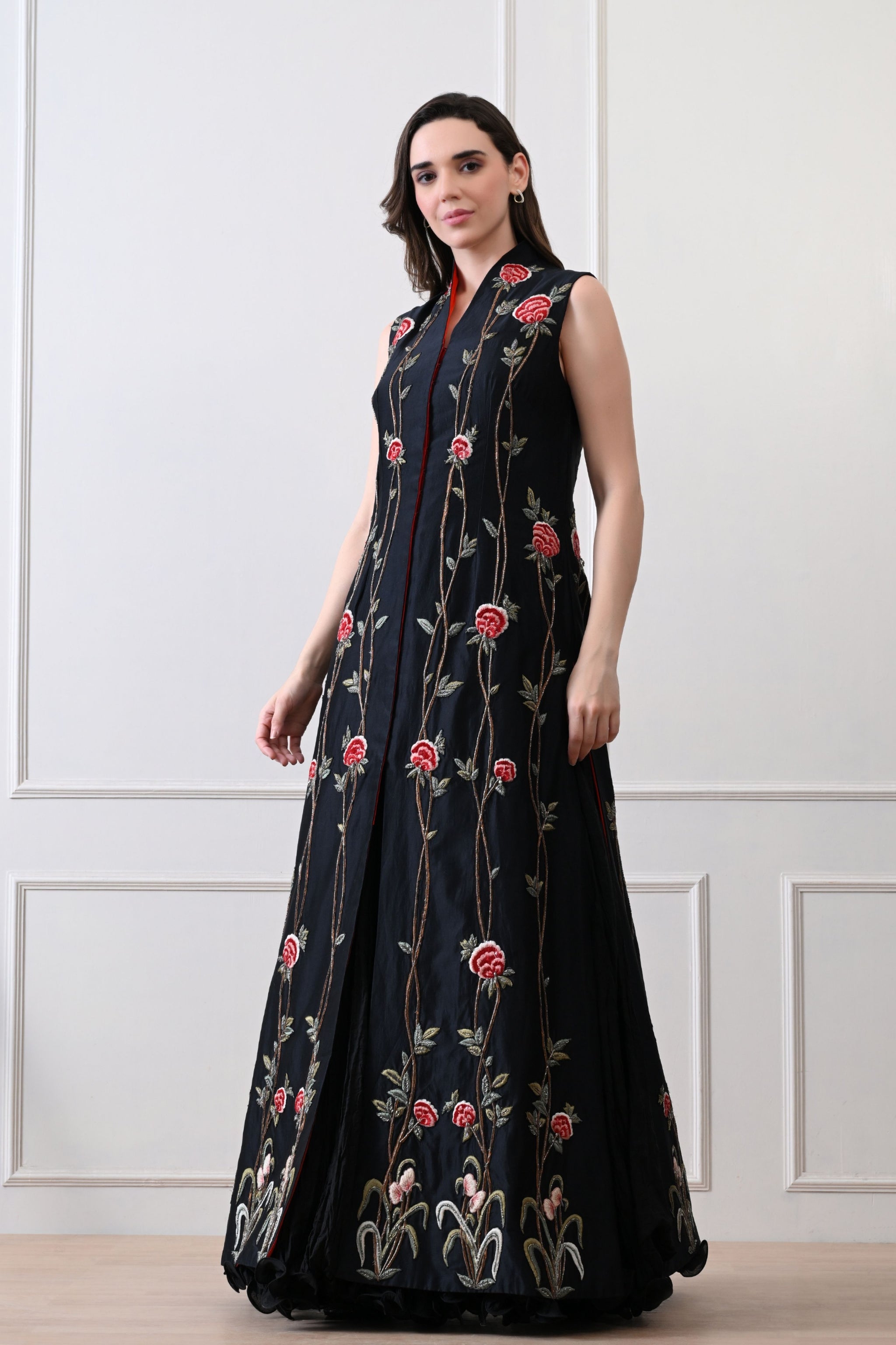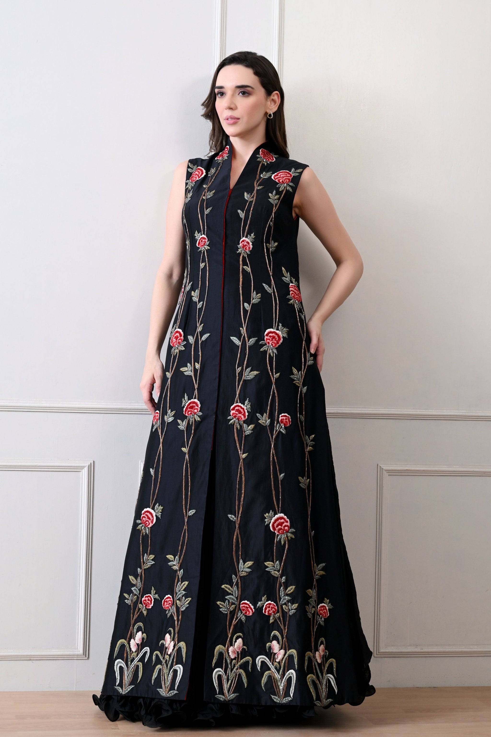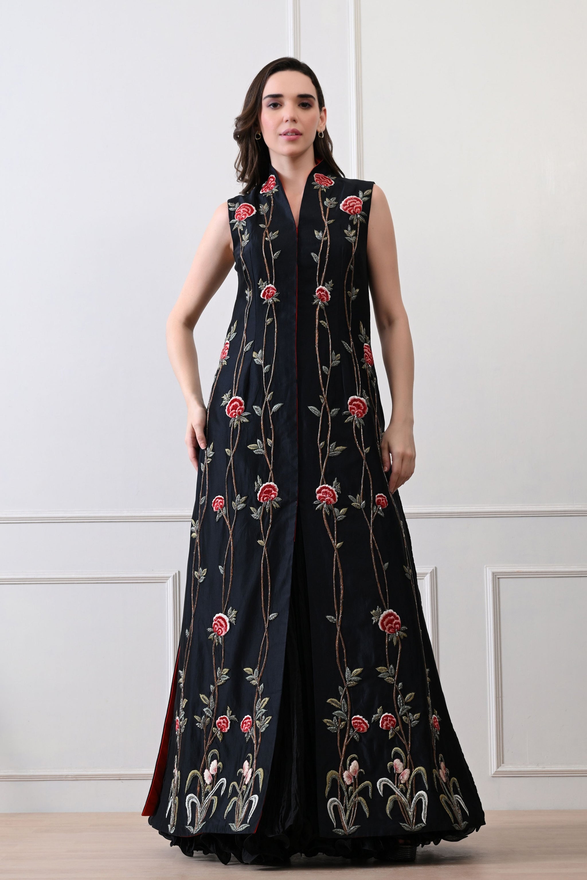 • Black v-neck jacket paired with a skirt, featuring intricate all-over embroidery in grey and jewel tones.