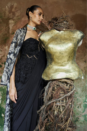 • A timeless black draped saree reimagined with contemporary finesse. The strapless embellished corset features intricate hand embroidery with tonal beadwork, adding depth and shimmer. Perfect for cocktail evenings and festive celebrations, this ensemble reflects Ridhima Bhasin's signature blend of bold sophistication and elegance.