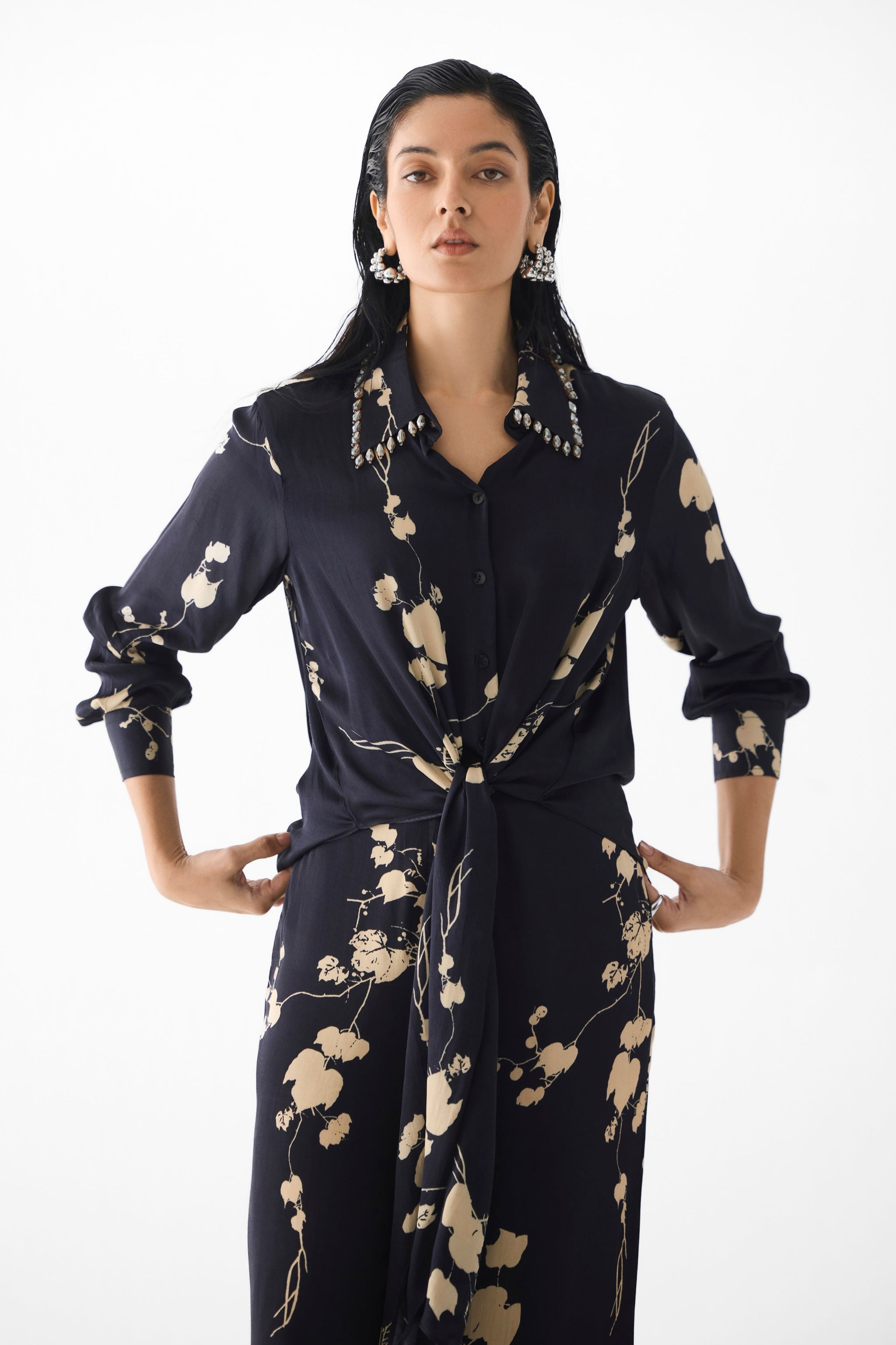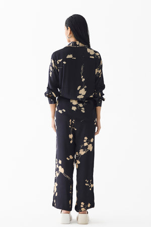 • The Black Sakura Crop Top & Pants crafted from our stunning vegan silk fabrication, trans-seasonal, is a statement piece. This set, printed in our black base sakura flower print, has a chic look. A 2 piece set, the crop top has a knot at the waist. It has hanging Swarovski detailing on the collar. It is paired with our matching black sakura straight pants with a front zipper and elasticated back. Wear it with heels for an elegant look. The model is wearing a Size S and is 5'8.