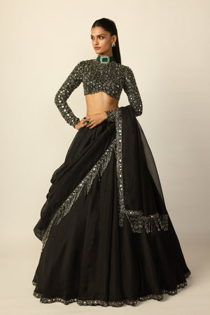• Black Organza Lehenga, paired with a heavily embroidered Zero neck blouse and a dupatta with cascading silver tassels.