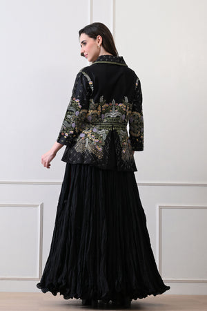 • Black jacket with intricate all-over embroidery in gold and jewel tones, paired with a matching skirt, creating a regal and sophisticated ensemble