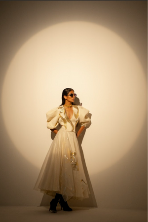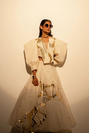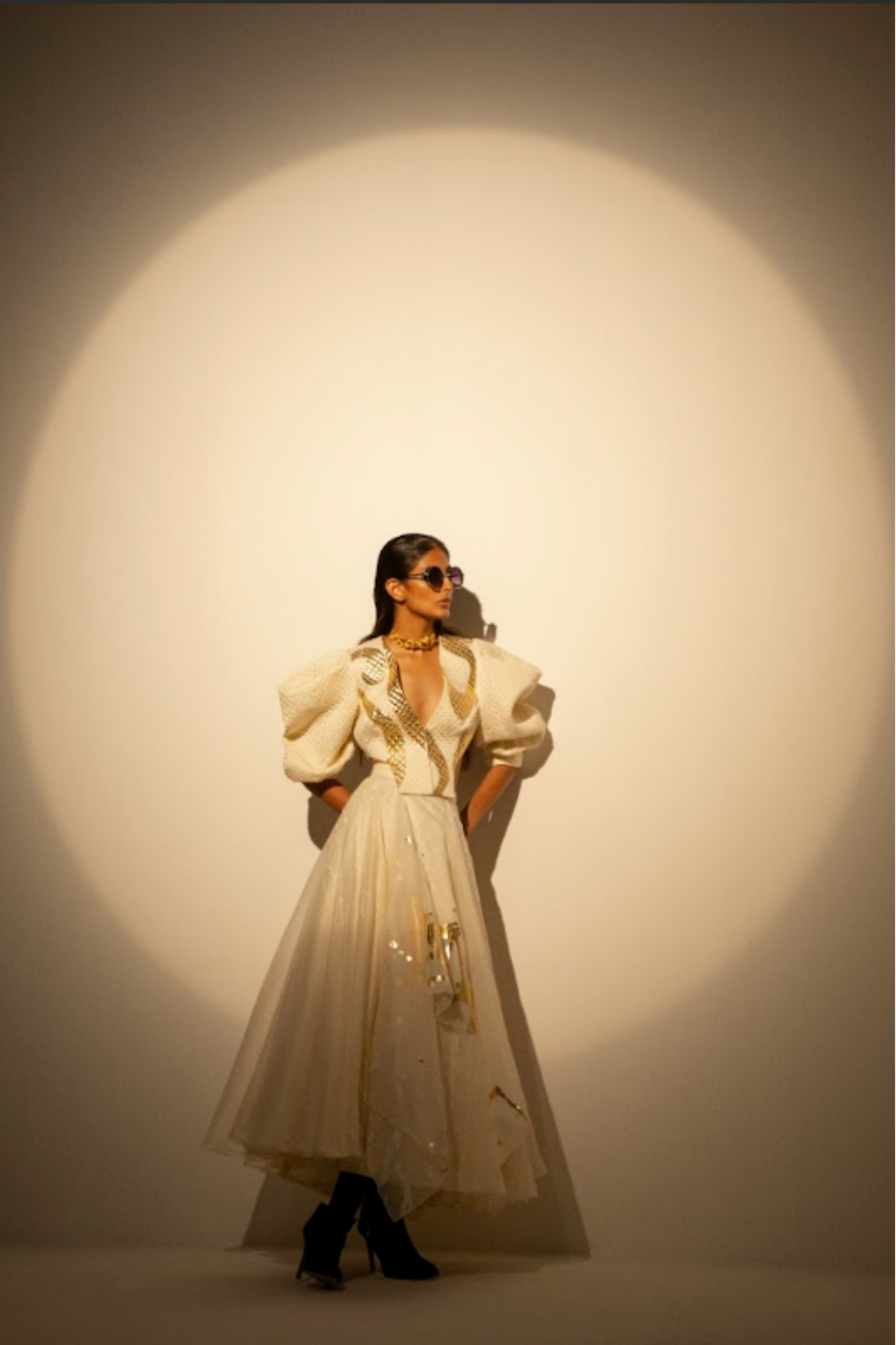• Beige quilted jacket with gold applique and exaggerated sleeves , beige organza skirt with gold foil print