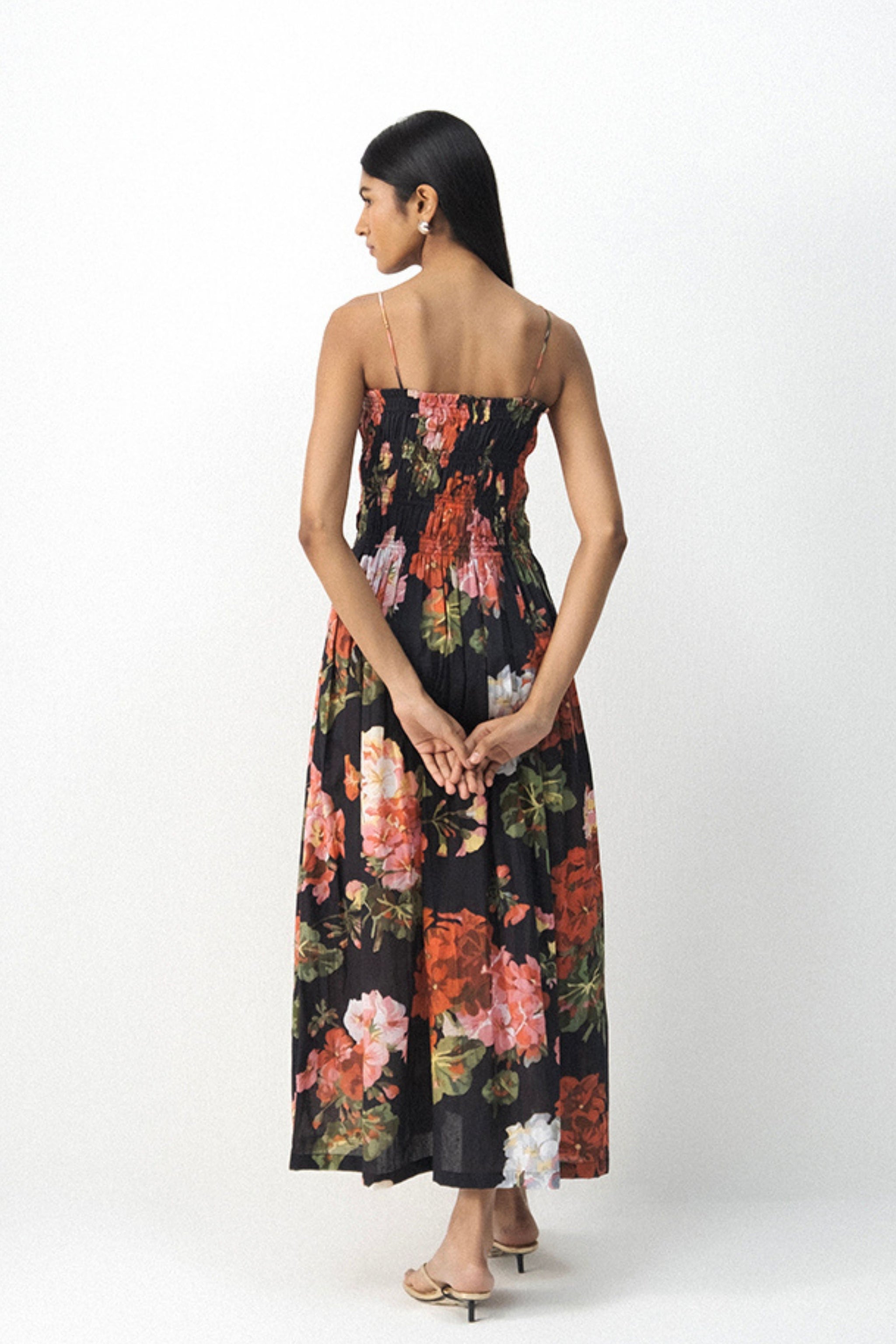 • Pair this versatile dress with flat sandals or espadrilles for an easy daytime look this floral midi dress is crafted in crisp poplin, making it a perfect blend of structure and comfort. Designed with a smocked bodice that offers a flattering, fitted silhouette and delicate straps, this piece beautifully accentuates the shoulders and neckline. The flowy skirt falls gracefully to mid-calf, while the addition of side pockets brings a practical yet relaxed touch. The bold floral print in vivid tones of red, pink, and green against a deep black base adds a striking visual charm, ideal for both casual and semi-formal occasions.