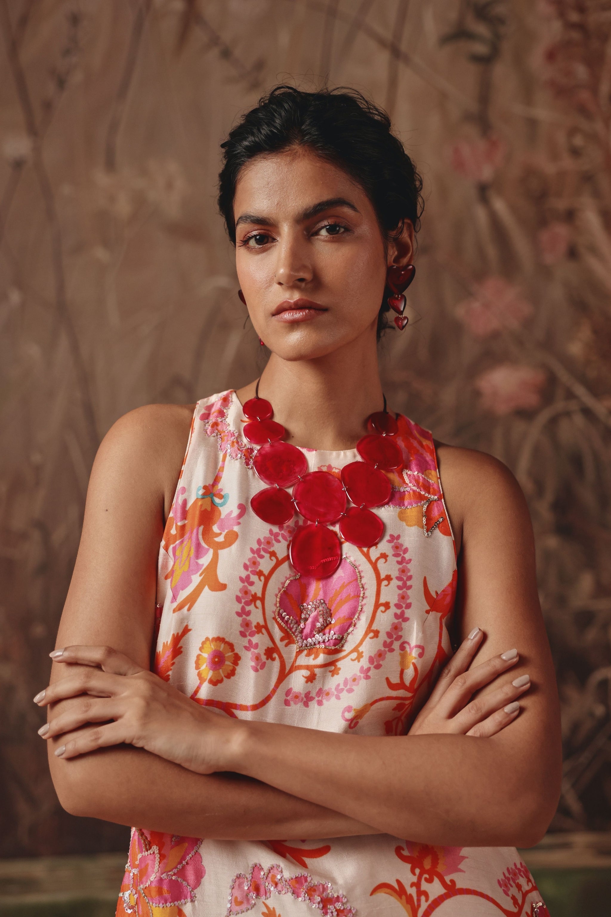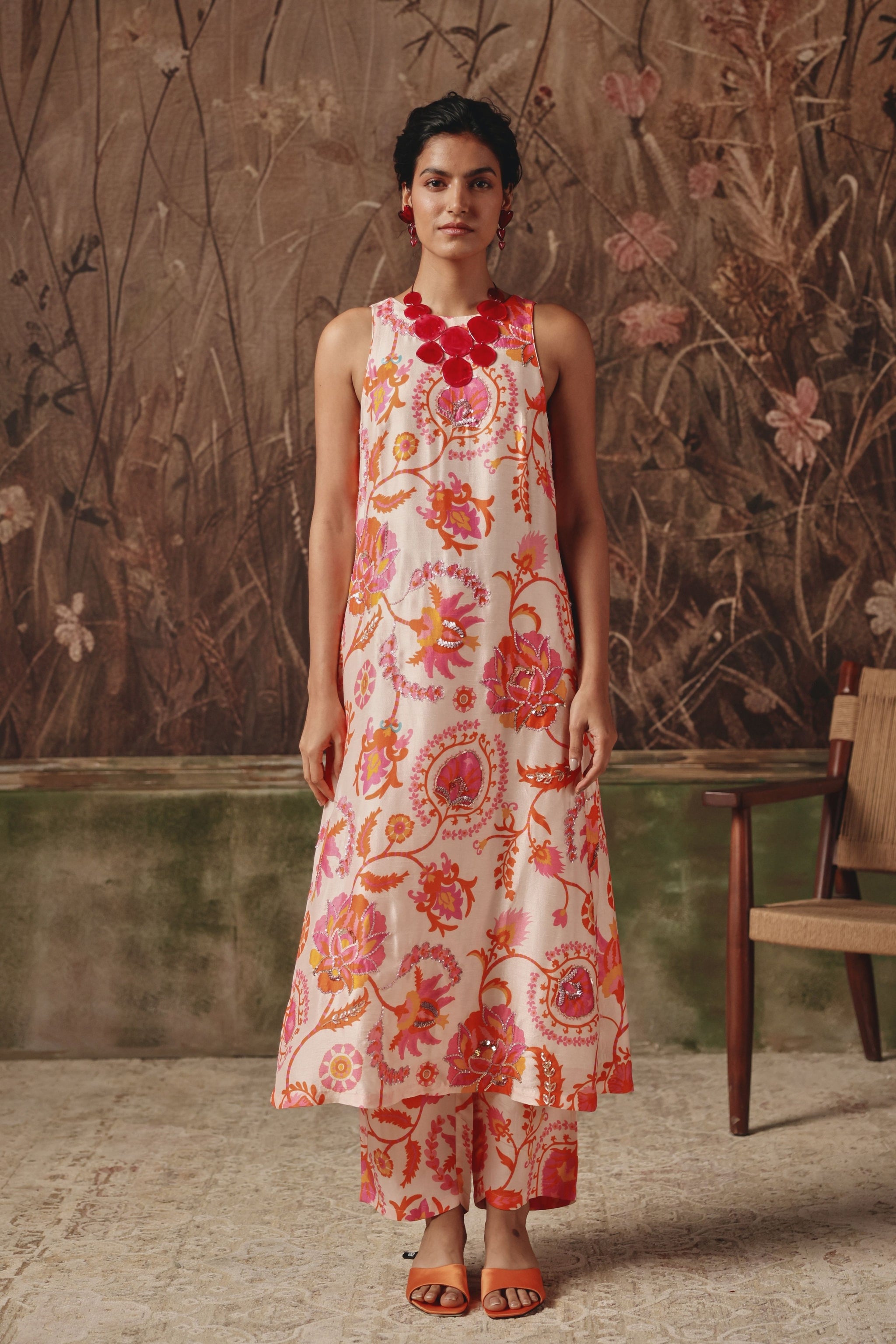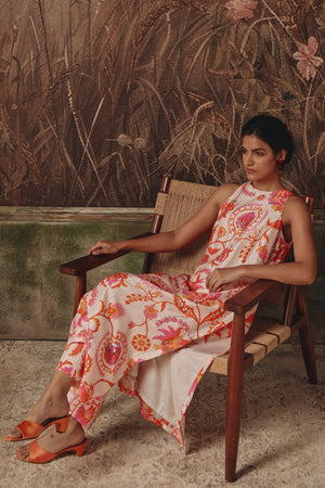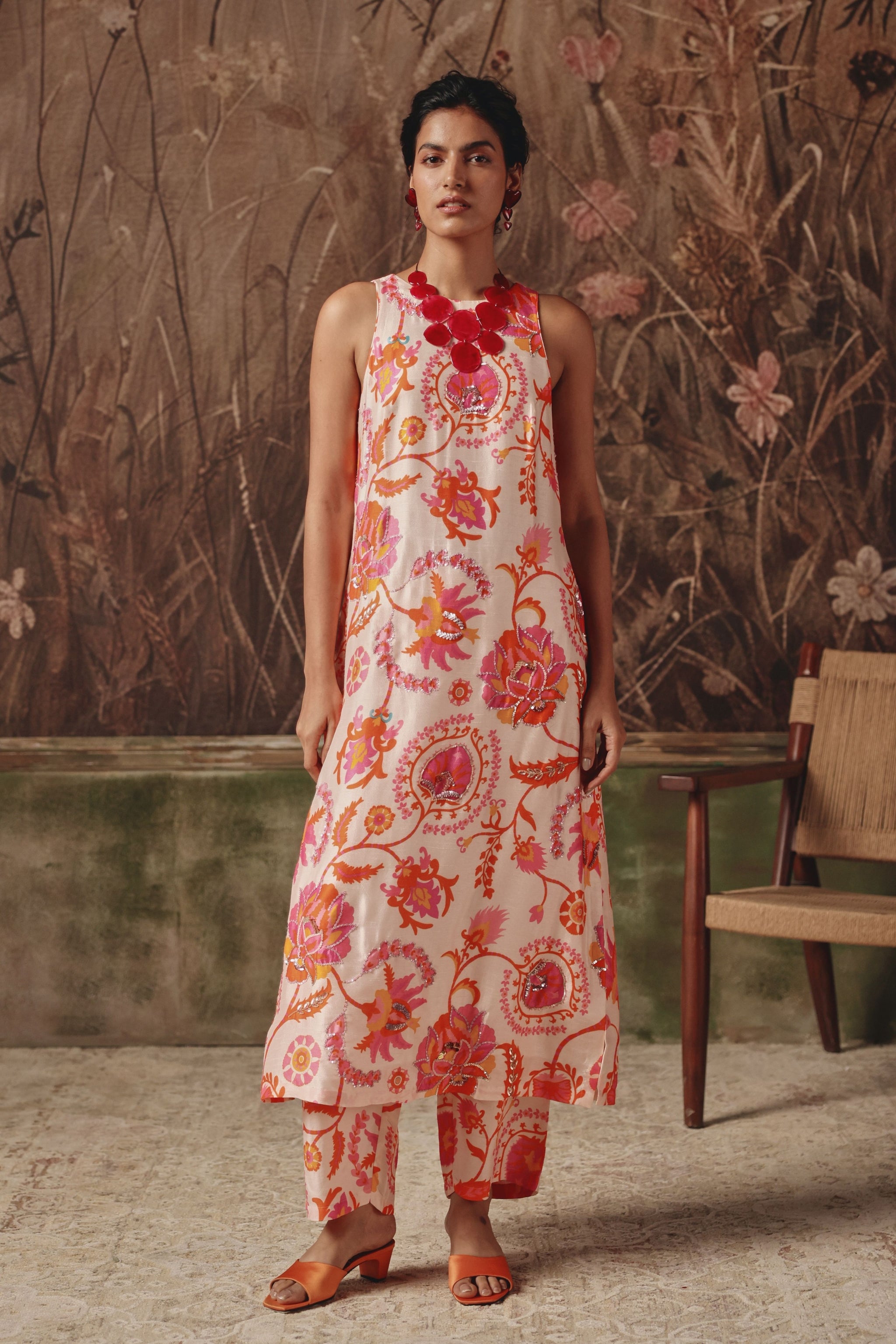 • A sleeveless kurta set painted with floral emblems reminiscent of silk route gardens. The fluid silhouette falls clean and straight, allowing the vivid pink and coral motifs to stand out against a soft ivory base. Light, contemporary, and delicately feminine, it brings heritage-inspired artistry to everyday elegance.