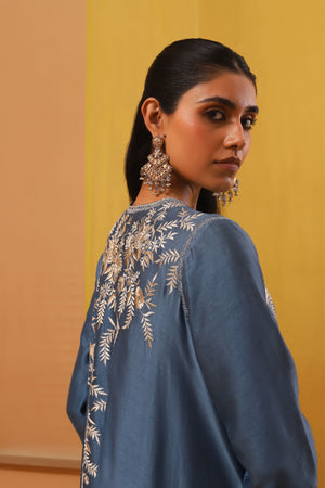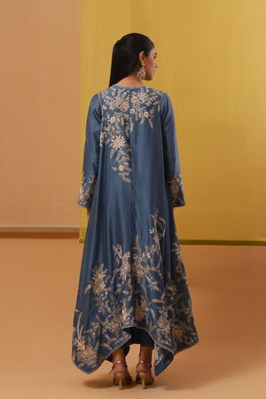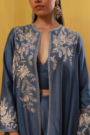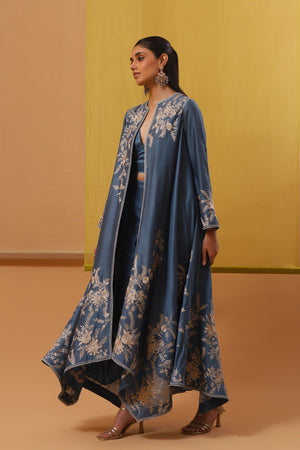 • Introducing our enchanting blue handwoven silk chanderi jacket set, a masterpiece of allure and sophistication. The asymmetrical cape-style jacket opens in the front and has full sleeves. It is adorned with delicate off-white and beige gara embroidery, intertwining silk threads to weave tales of elegance. Each hemline is kissed by silver zari work, casting a spell of opulence. Paired with matching luxurious handwoven silk chanderi straight-fit pants and a stylish pure silk satin bustier. This ensemble is a symphony of romance and timeless beauty, perfect for those who wish to dance through life in exquisite style.