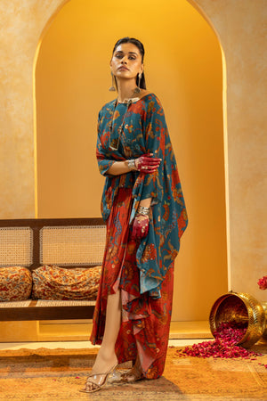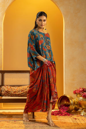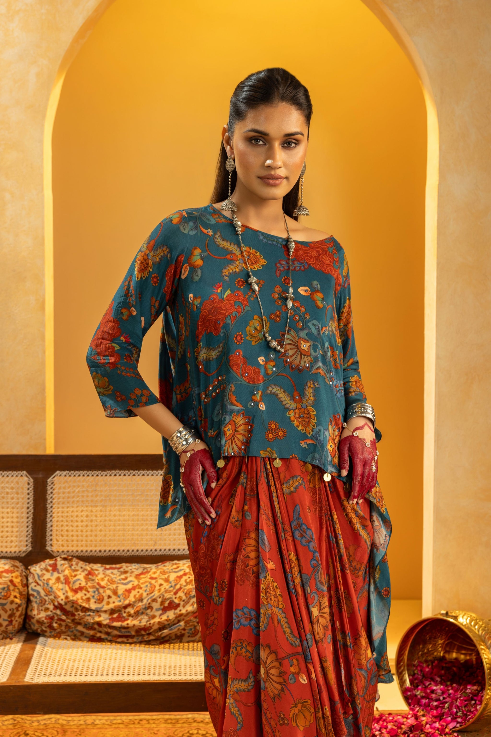 • Blue rangtara embellished asymmetric top with, paired with a printed crepe skirt