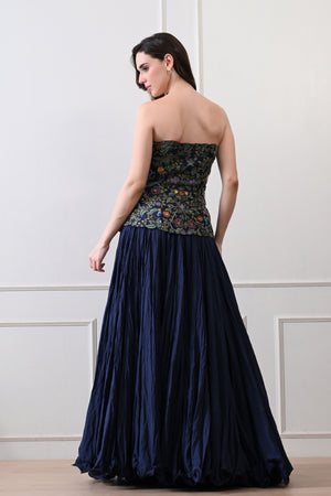 • Blue corset-top with intricate all-over floral embroidery, paired with a matching flowing skirt, creating a chic and elegant ensemble
