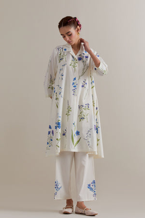• Off white hand block printed a-line short kurta with all-over blue & green coloured flower. The edges of neck, sleeve and hem finished with ric rac. It has a shirt collar neckline in the front and 3/4 sleeves. Paired with off white cotton straight pants with blue and green floral hand block printed boots at sides. It has side pockets and an elasticated waistband with drawstrings in the front for a better fit. Comes with off white cotton chanderi dupatta with all-over blue & green floral hand block print. The edges of the dupatta are finished with ric rac. The corners of the dupatta have beaded tassels.