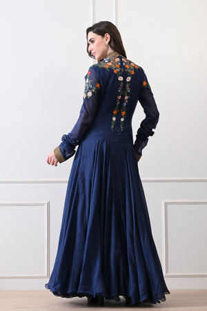 • Blue floor-length dress crafted from flowing fabric, featuring a gracefully flared silhouette that exudes timeless charm and sophisticated elegance.