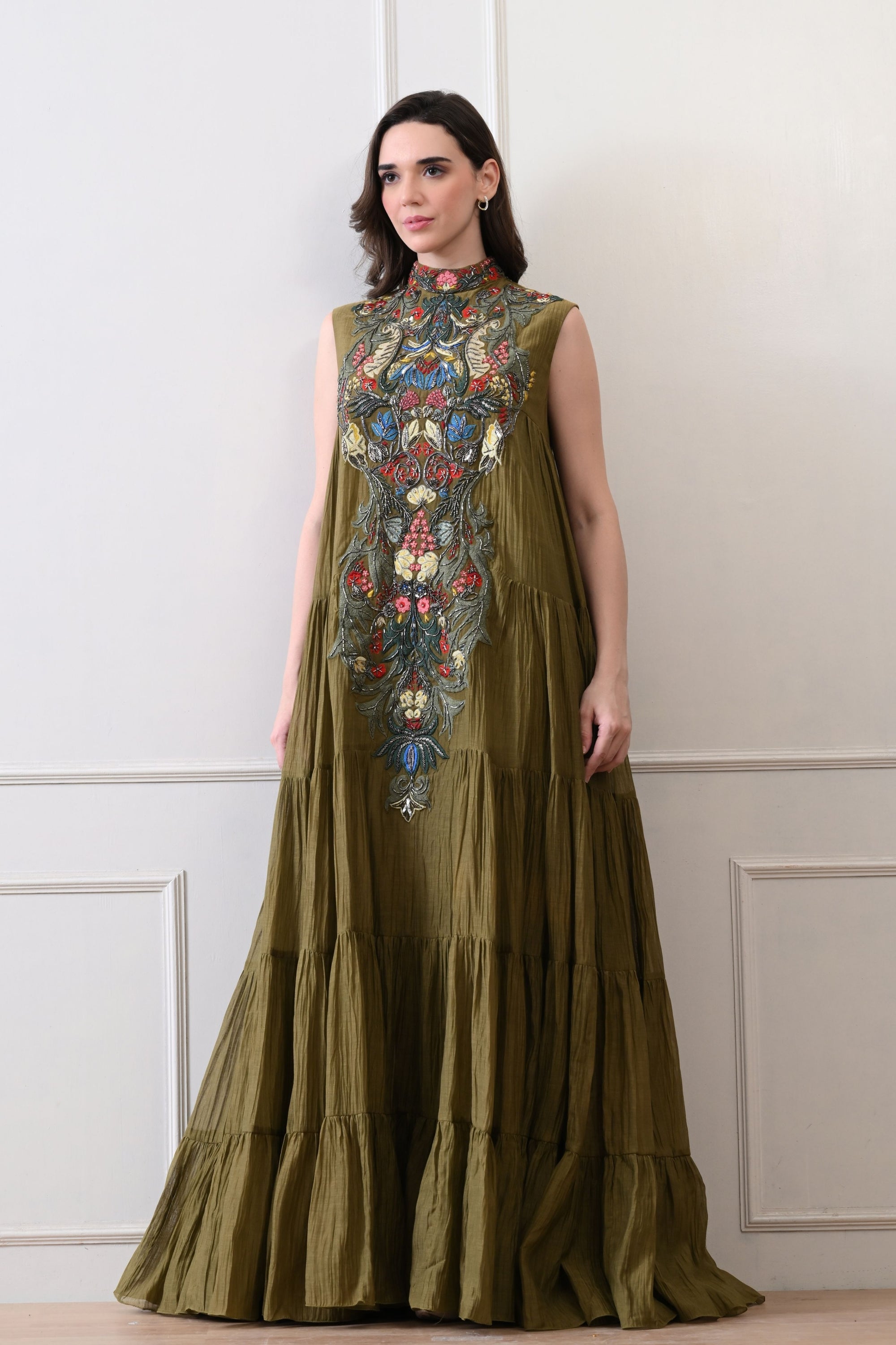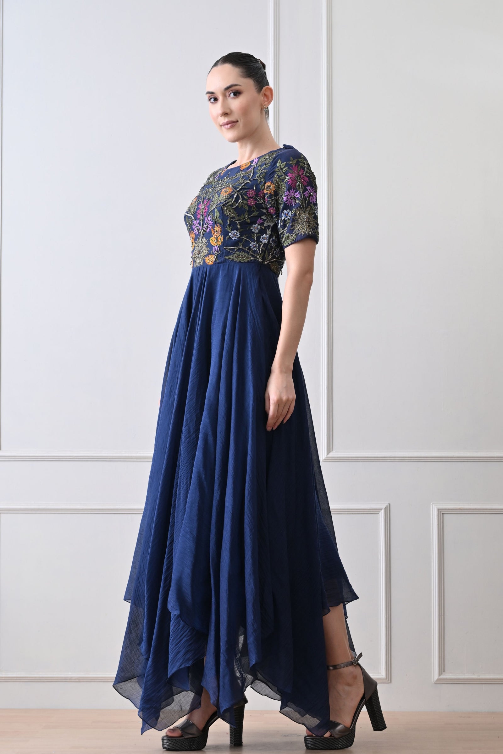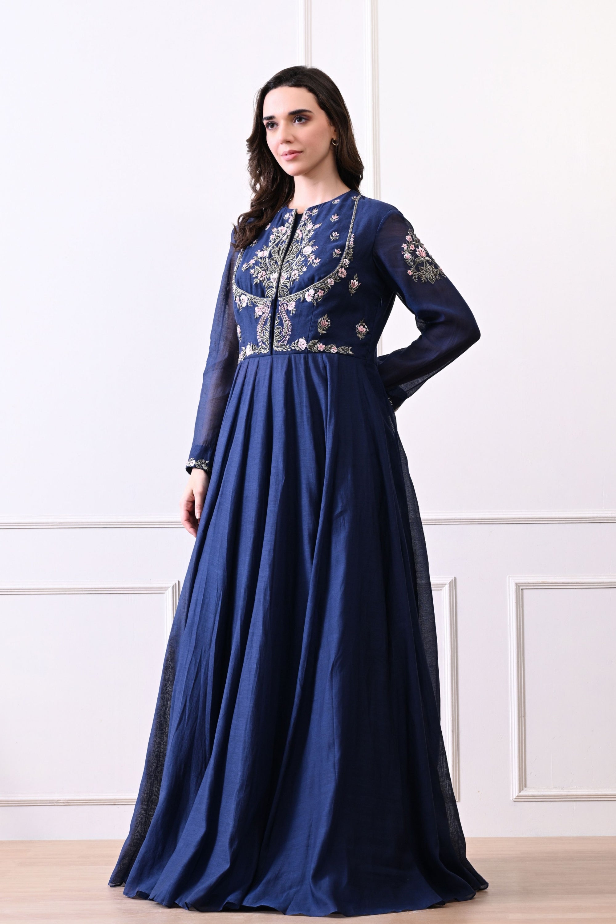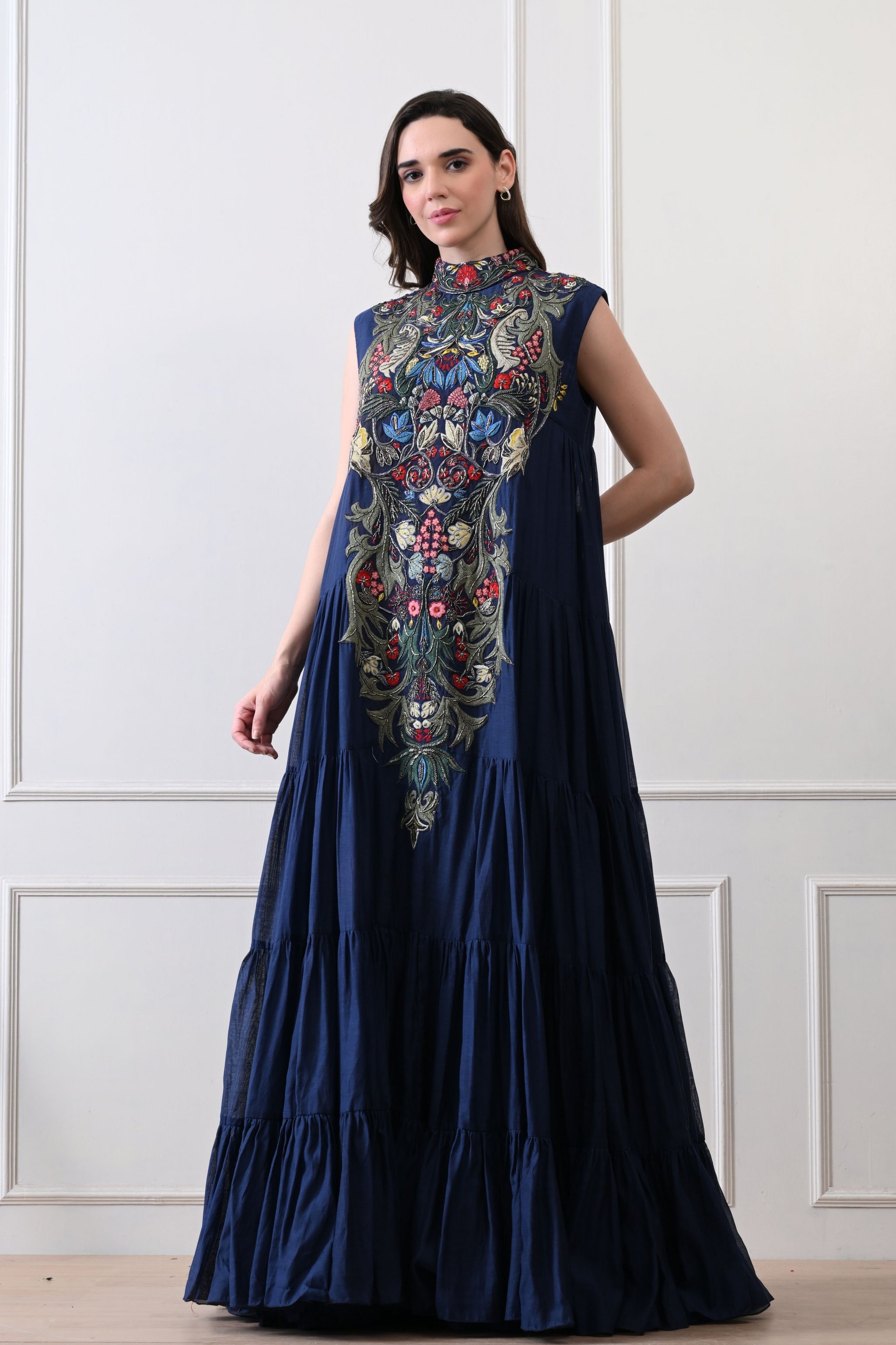 • Blue embroidered high-neck couture maxi dress in rich cotton silk, sleeveless and exquisitely adorned with fine thread embroidery and opulent zardozi detailing, exuding timeless elegance and regal sophistication.