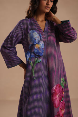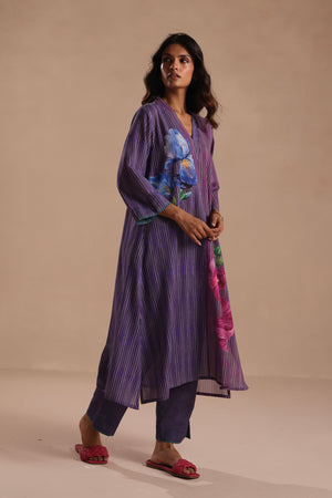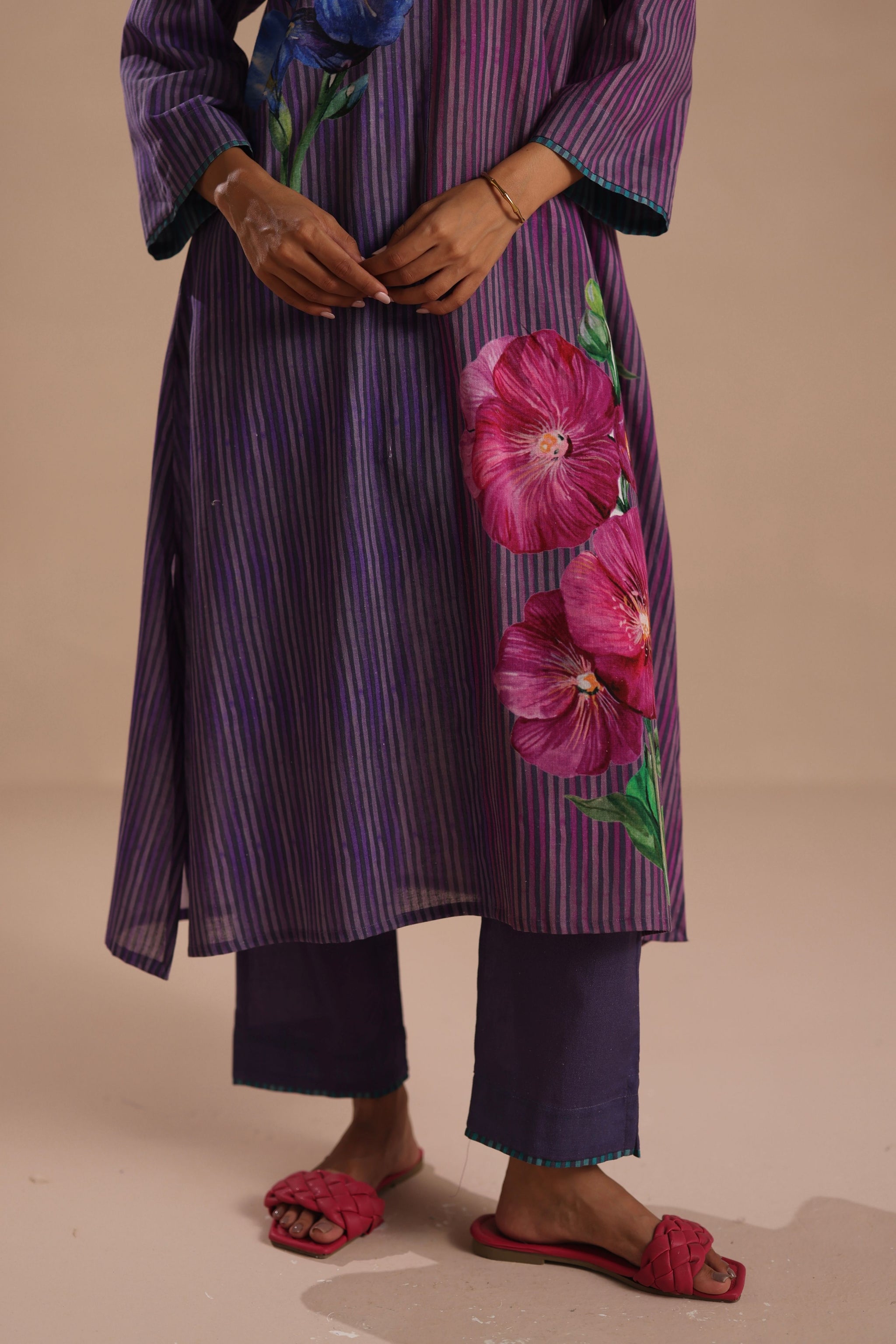 • A linen kurta set with hand drawn watercolor stripes, and bold floral hand drawn flowers. Paired with solid purple straight pants to elevate your festive outings. The kurta length-45" and the pant length-36"