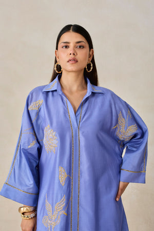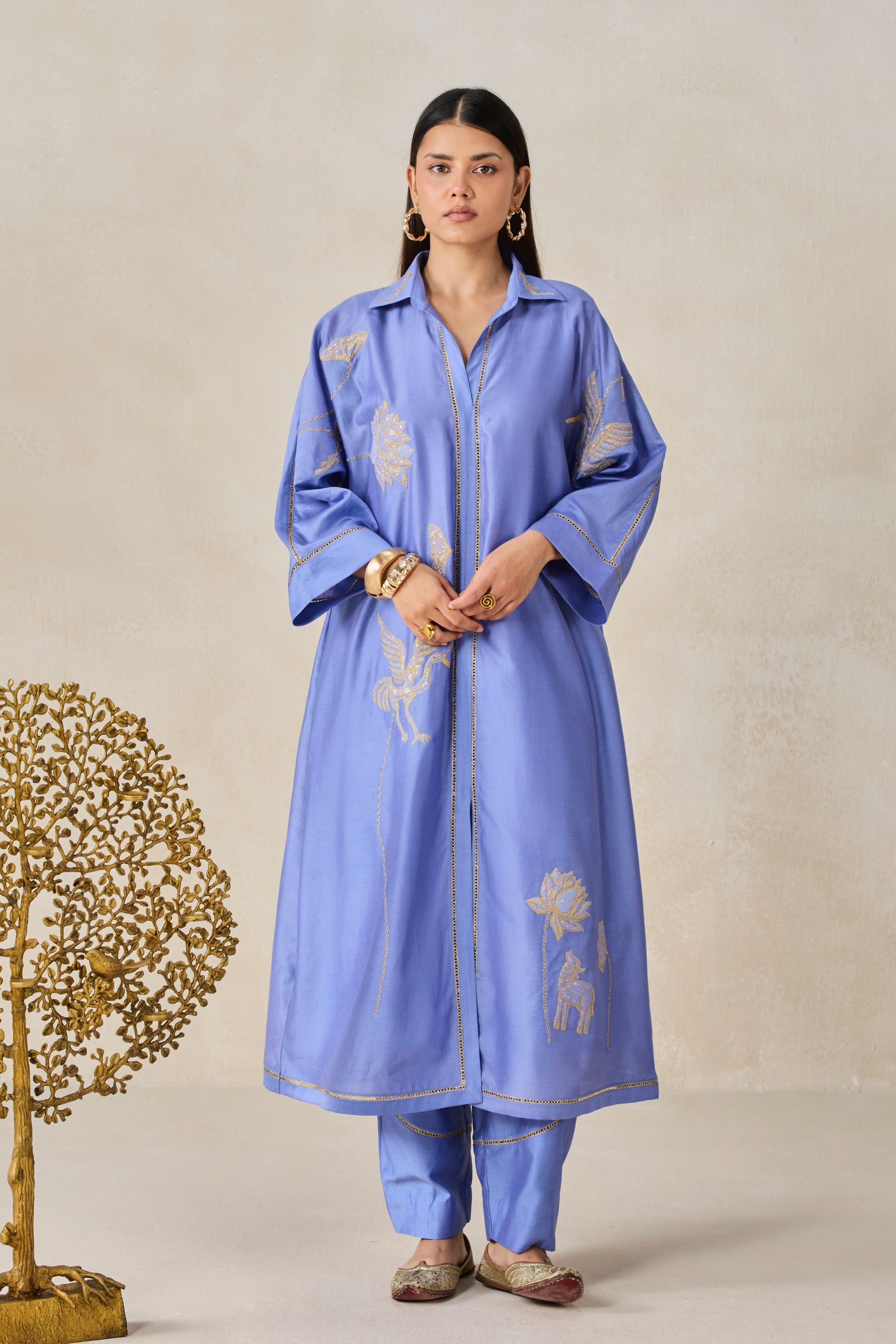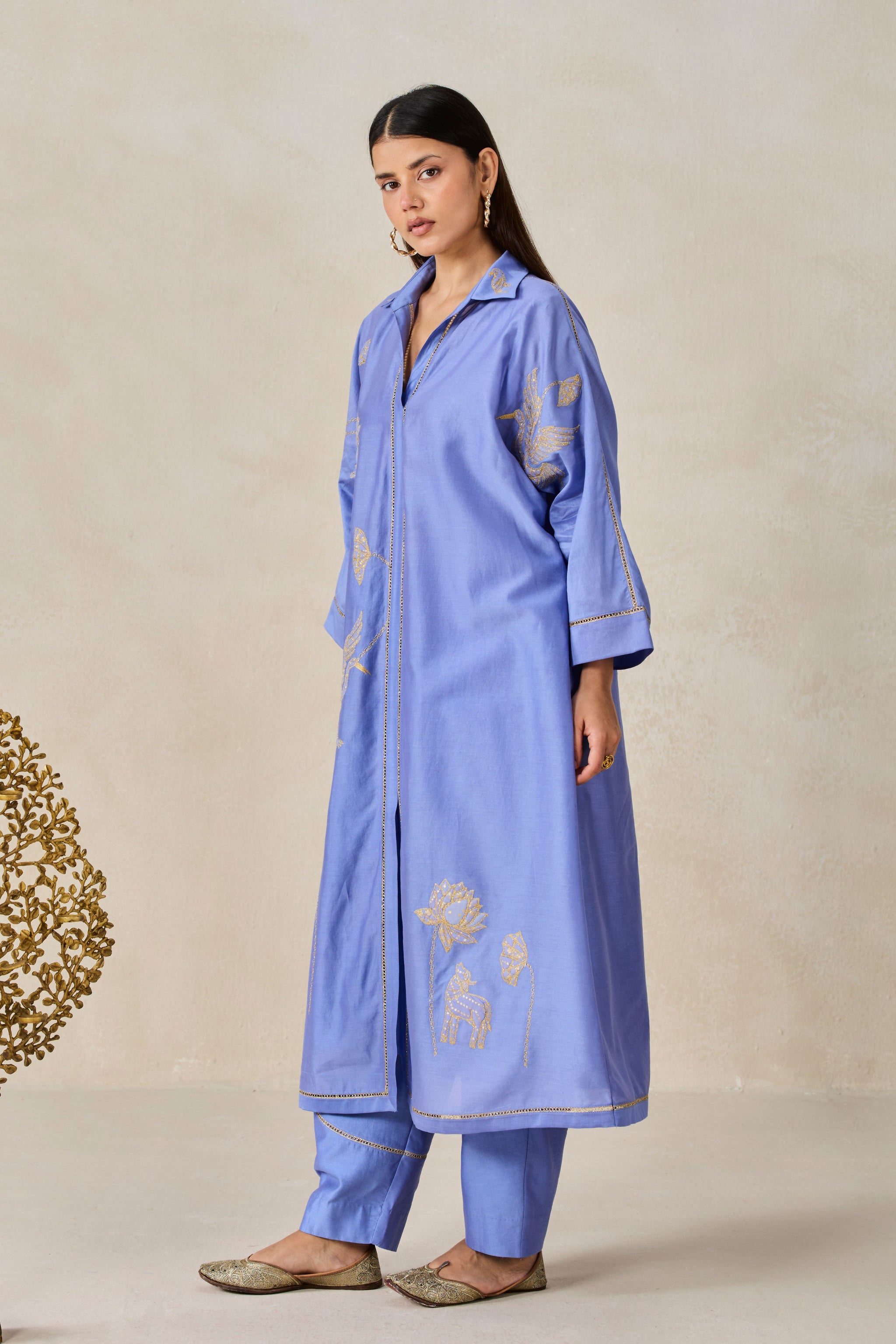• This is a refined two-piece kurta and salwar set crafted in luxurious Chanderi fabric, presented in an ink blue tone. The ensemble blends minimal tailoring with narrative, heritage-inspired embroidery, resulting in an elegant yet contemporary statement. The kurta features delicate applique work, placed with restraint and intention, Crane/bird motifs & Lotus floral motifs