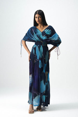 • The dress is crafted in lightweight, flowy fabric, this gown features a captivating hand-painted-inspired print in oceanic shades of cobalt, navy, turquoise. The silhouette is defined by its dramatic draped bodice, featuring soft gathers that cascade effortlessly across the shoulders and sleeves. The dress cinched waistline enhances definition, while the full-length skirt flows gracefully with every movement, embodying elegance and ease in equal measure. Adjustable drawstring ties on the sleeves add a delicate detail, allowing for a personalized fit and styling versatility.