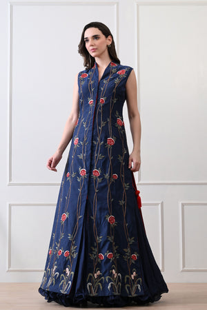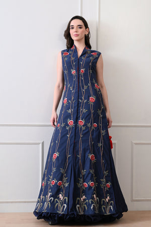 • Blue v-neck jacket paired with a skirt, featuring intricate all-over embroidery in grey and jewel tones.