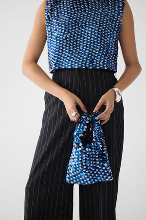 • The Blue Paradise Sequin Top crafted from our stunning organza fabrication, trans-seasonal, is a statement piece. This blouse, is hand embroidered with tricolour sequin all over resembling the birds of paradise flower. Sleeveless with side zippers, this blouse has a high neck collar with back hooks.  It can be paired with our contrast suiting pants  in black colour. Wear it with heels for an elegant look. The model is wearing a Size S and is 5'10.