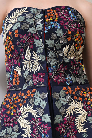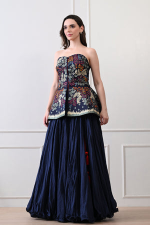 • Blue corset-style top with intricate all-over floral embroidery, paired with a matching flowing skirt, creating a chic and elegant ensemble
