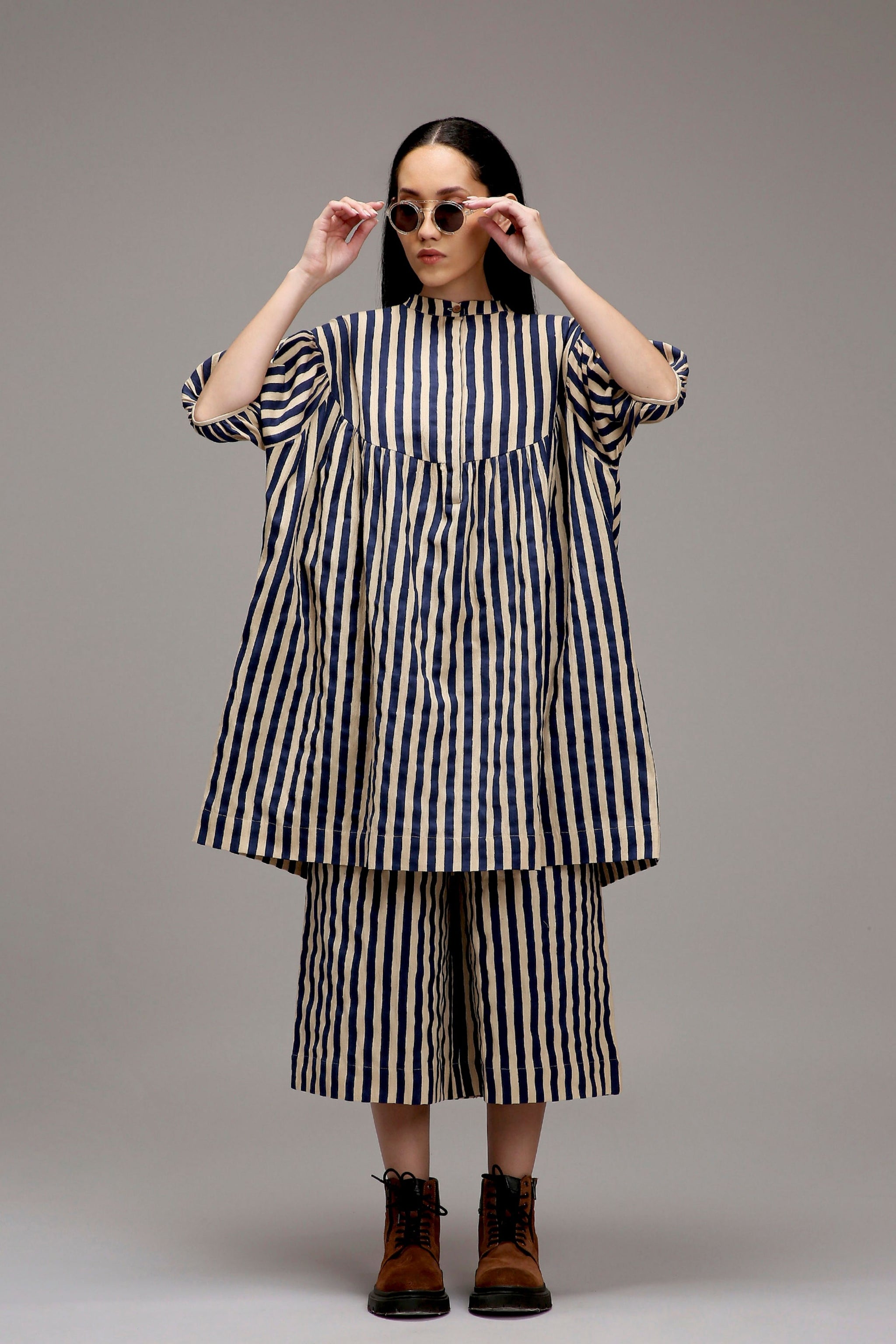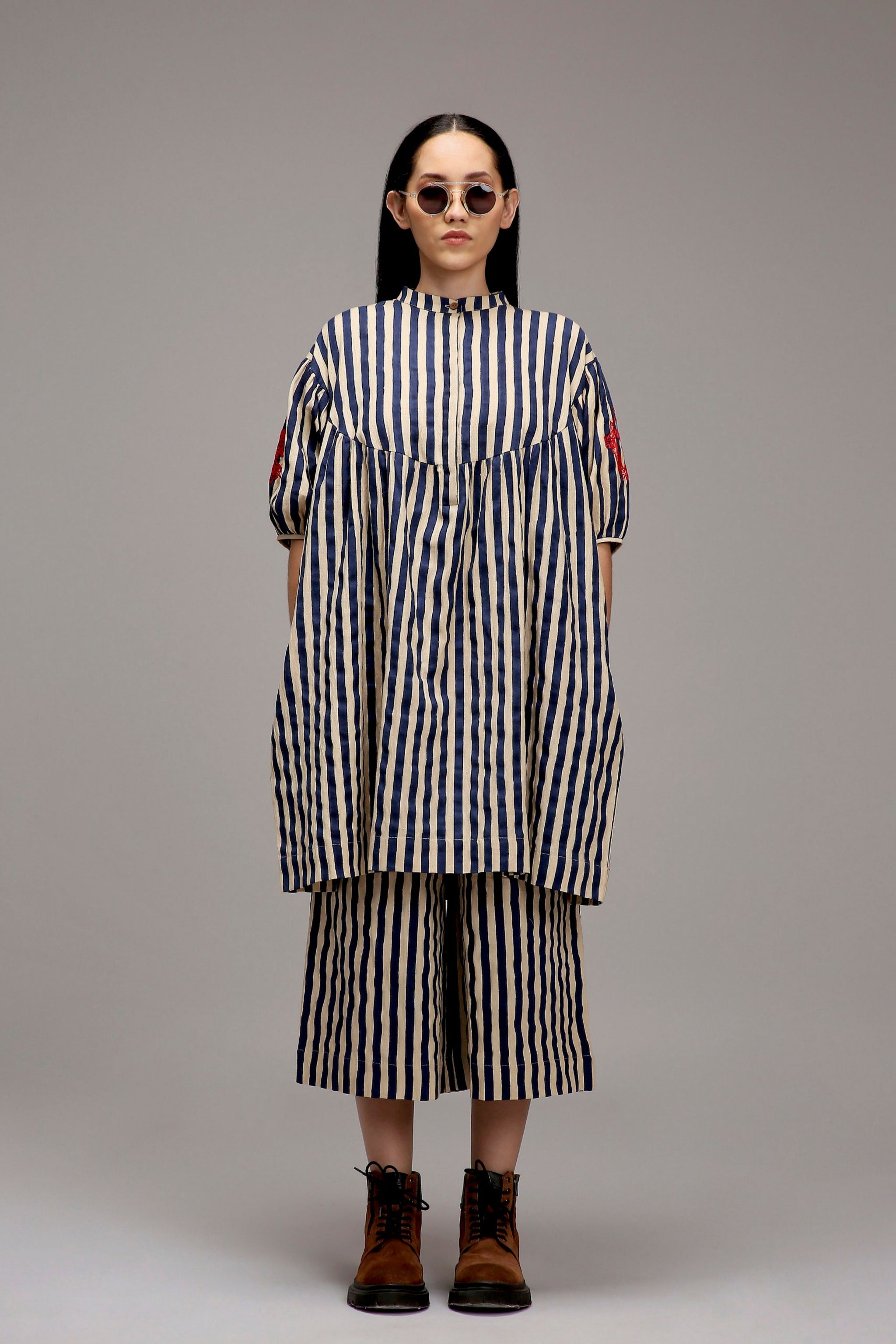 • The classic acra tunic is a loose, comfortable kaftan-style outfit made from handspun cotton. It features hand-block printed stripes and beautifully hand-embroidered sleeves with joker thread work. With a front button opening and handy side pockets, it blends ease with style. Pair it with the matching striped pants for a complete and modern look.