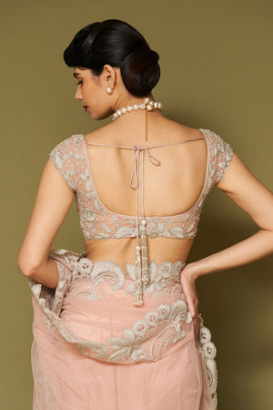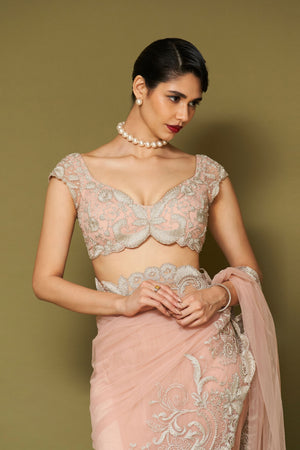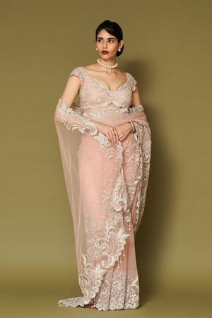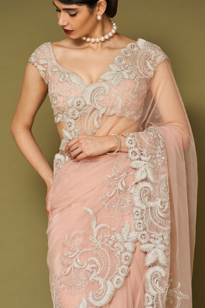 • Crafted in delicate net, this blush pink saree is richly embellished with intricate zari work and fine hand embroidery, creating a look that is both graceful and timeless. Paired with a matching net blouse featuring coordinated embroidery, the ensemble exudes elegance with a hint of opulence.