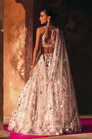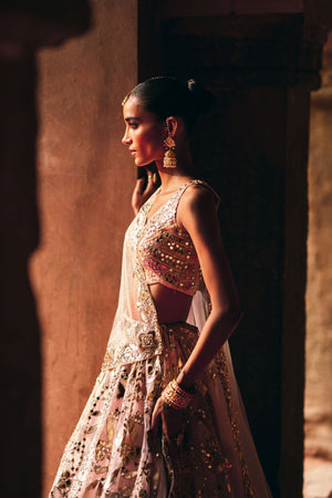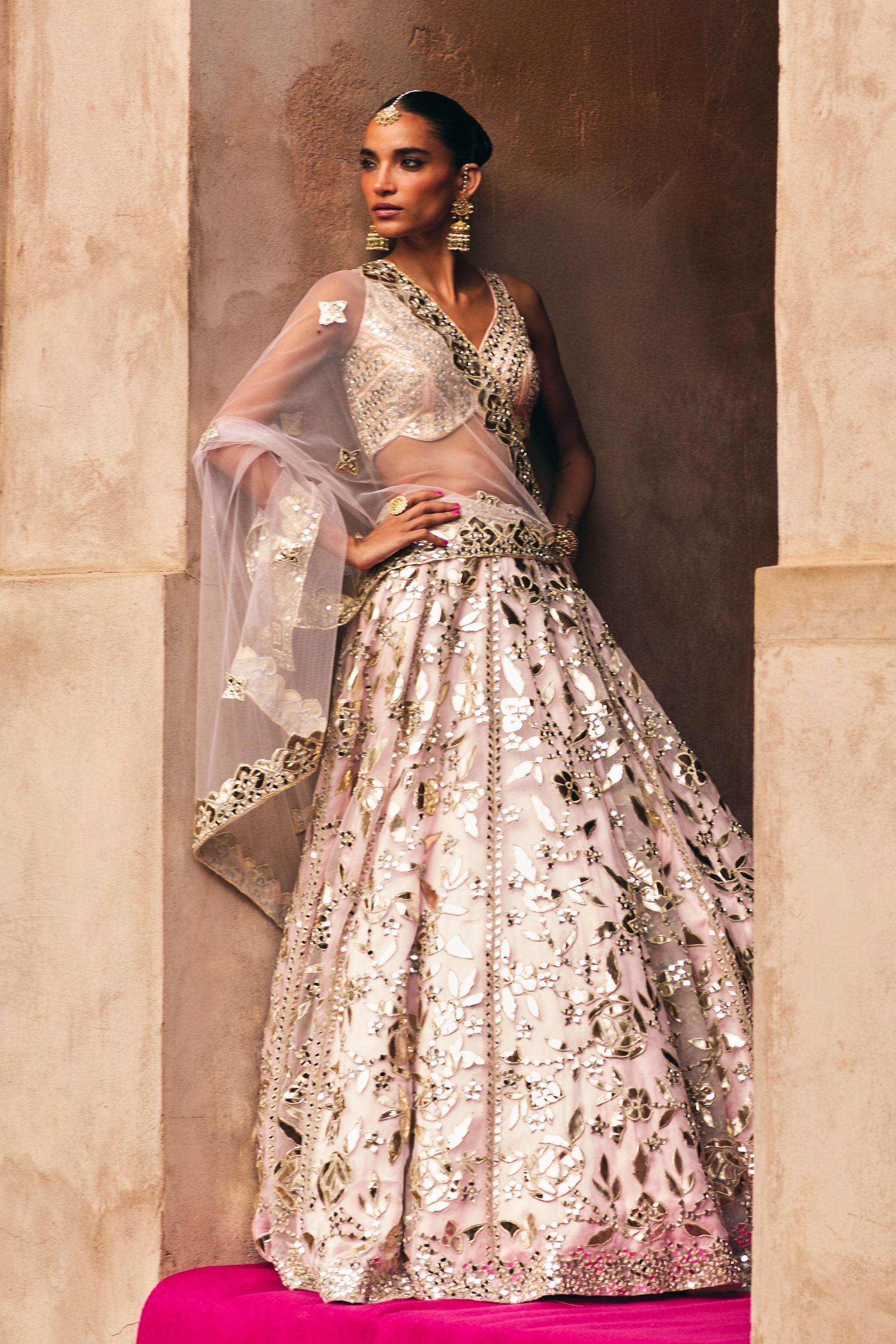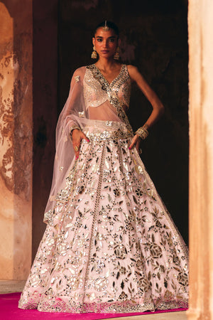 • Blush pink lehenga scattered with florals motifs in mirror and leather applique, detailed with fine gota work.